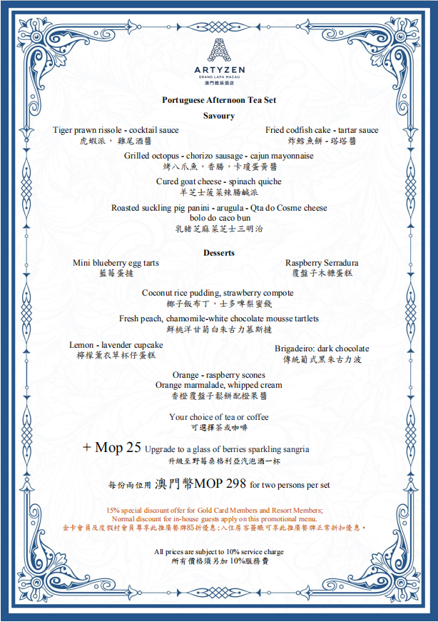2、以上推廣價目為澳門幣及另收10%服務費。