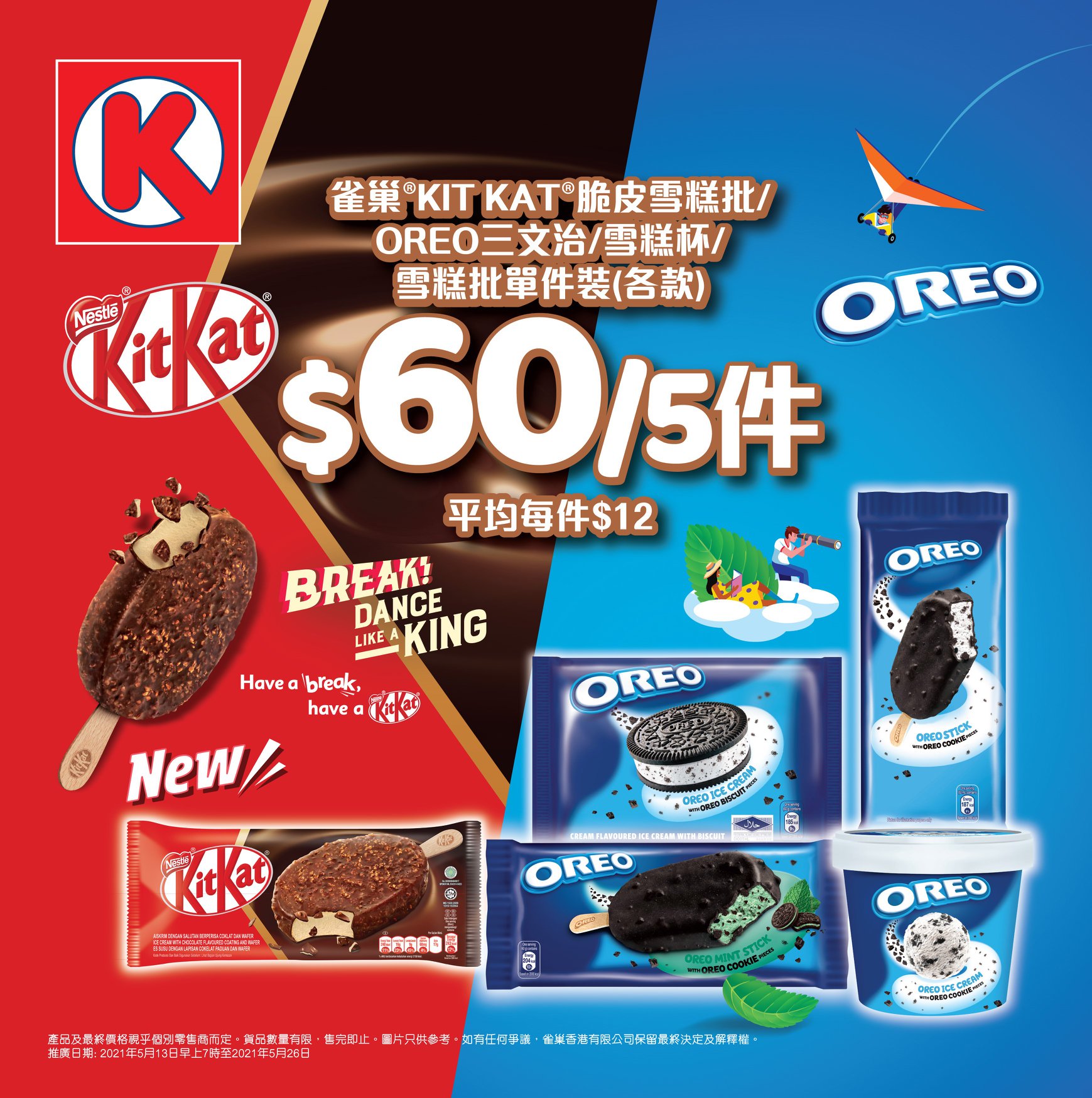 由即日起到5月26日,嚟OK任揀5款 (KITKAT脆皮雪糕批/ OREO三文治/ OREO雪糕杯/ OREO雪糕批),組合優惠價$60 / 5件 (平均每件$12)