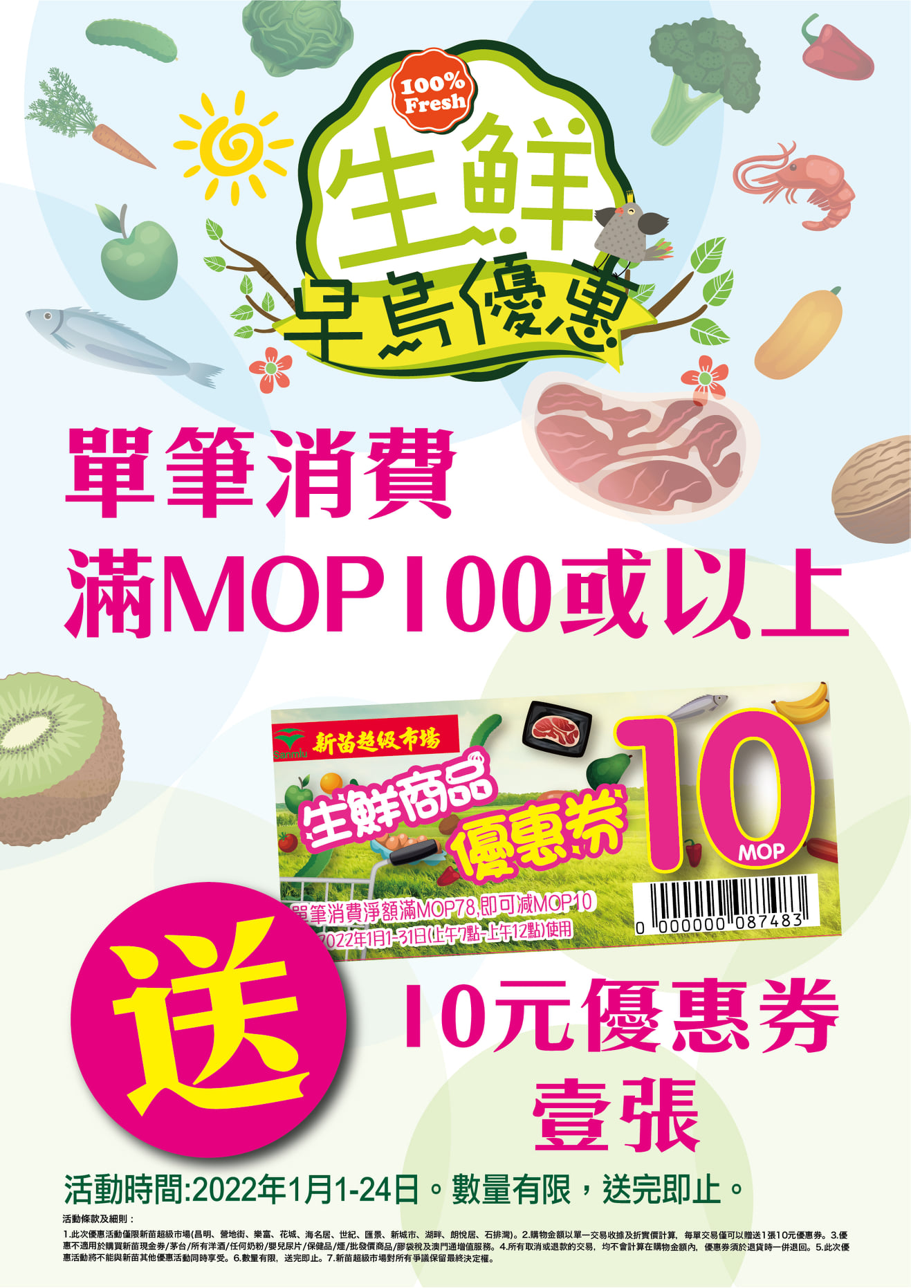 依家嚟新苗購物滿$100,即送$10生鮮優惠券1張,數量有限,送完即止。