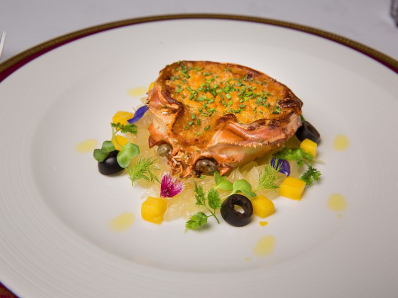 五道美饌「品嘗套餐」:特式焗釀松葉蟹蓋、黑松露烏雞清湯伴鵪鶉蛋、炭燒馬介休配蘆筍炒蛋、串燒美國牛小排及鵝肝配葡國砵酒汁、木糠布甸蛋糕伴葡式酒香雪糕