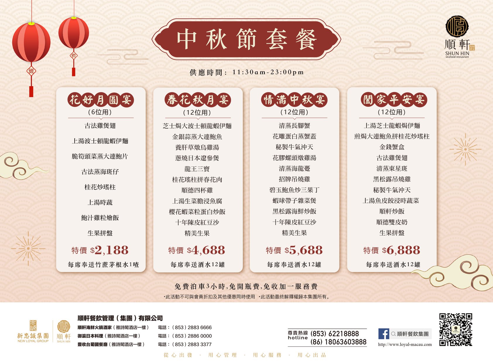 情滿中秋宴12人餐特價$5688,每席奉送酒水12罐,