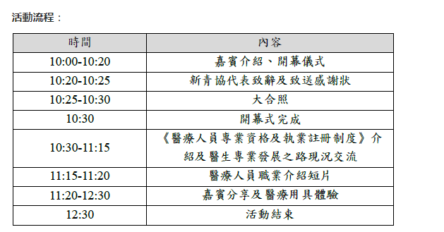 為了讓有志投身醫療衛生範疇的青少年能提早規劃人生,活動將邀請多位不同範疇的醫療人員到場作職業介紹及分享,包括中醫、西醫、護理、醫務檢驗、放射、物理治療、職業治療、語言治療、口腔、營養、藥劑、藥劑技術、心理範疇,提供醫療行業的資訊,包括相關職業的就學、就業途徑及要求,活動亦會詳細介紹《醫療人員專業資格及執業註冊制度》,幫助有志投身醫療衛生範疇的青少年能提早為升學選科做好準備。