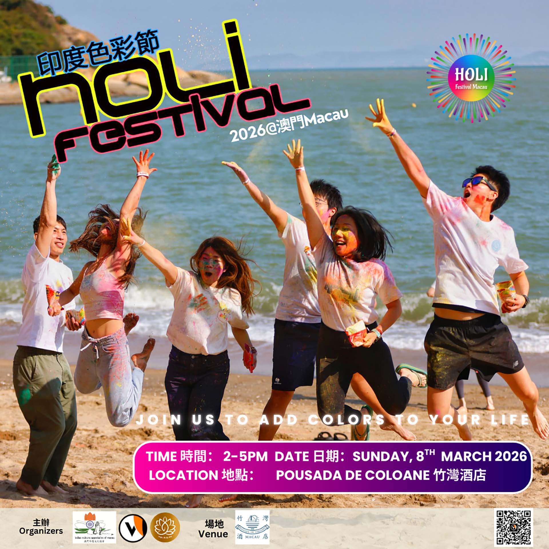 印度傳統盛事「印度色彩節2026@澳門」繼續為大家帶來歡樂及色彩!活動節目精彩豐富,包括面部彩繪、色彩瑜伽、音樂、寶萊塢與傳統印度舞、遊戲及印度特色小食等。歡迎到場感受節日氣氛,度過充滿色彩及歡笑的一天。