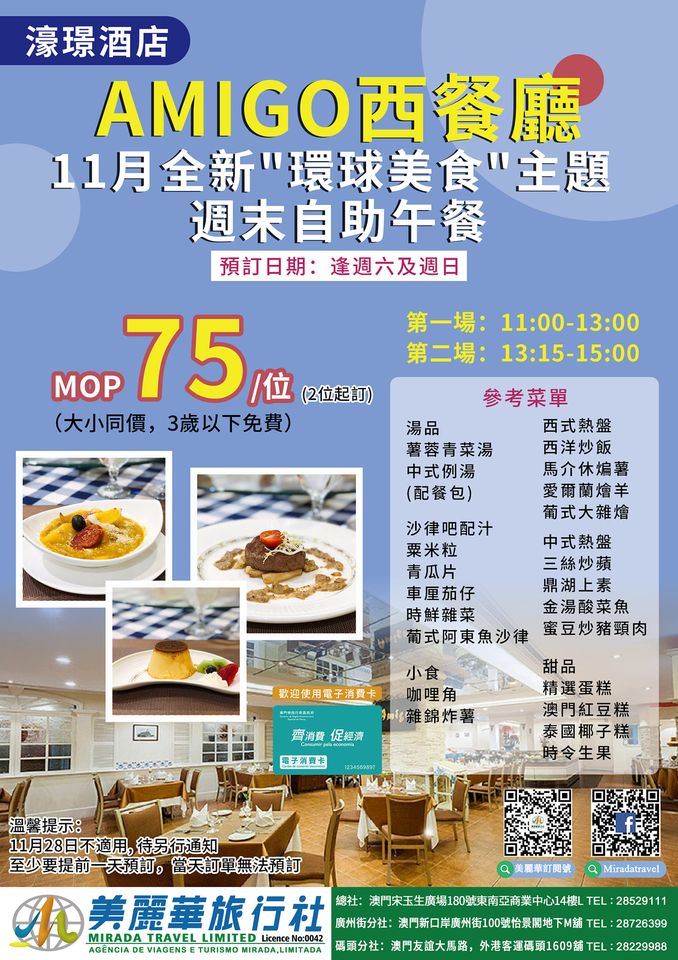 濠璟酒店AMIGO西餐廳週末自助午餐優惠澳門幣75元/位