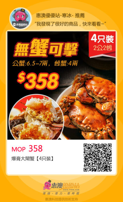 爆膏大閘蟹「4只裝」優惠價$358