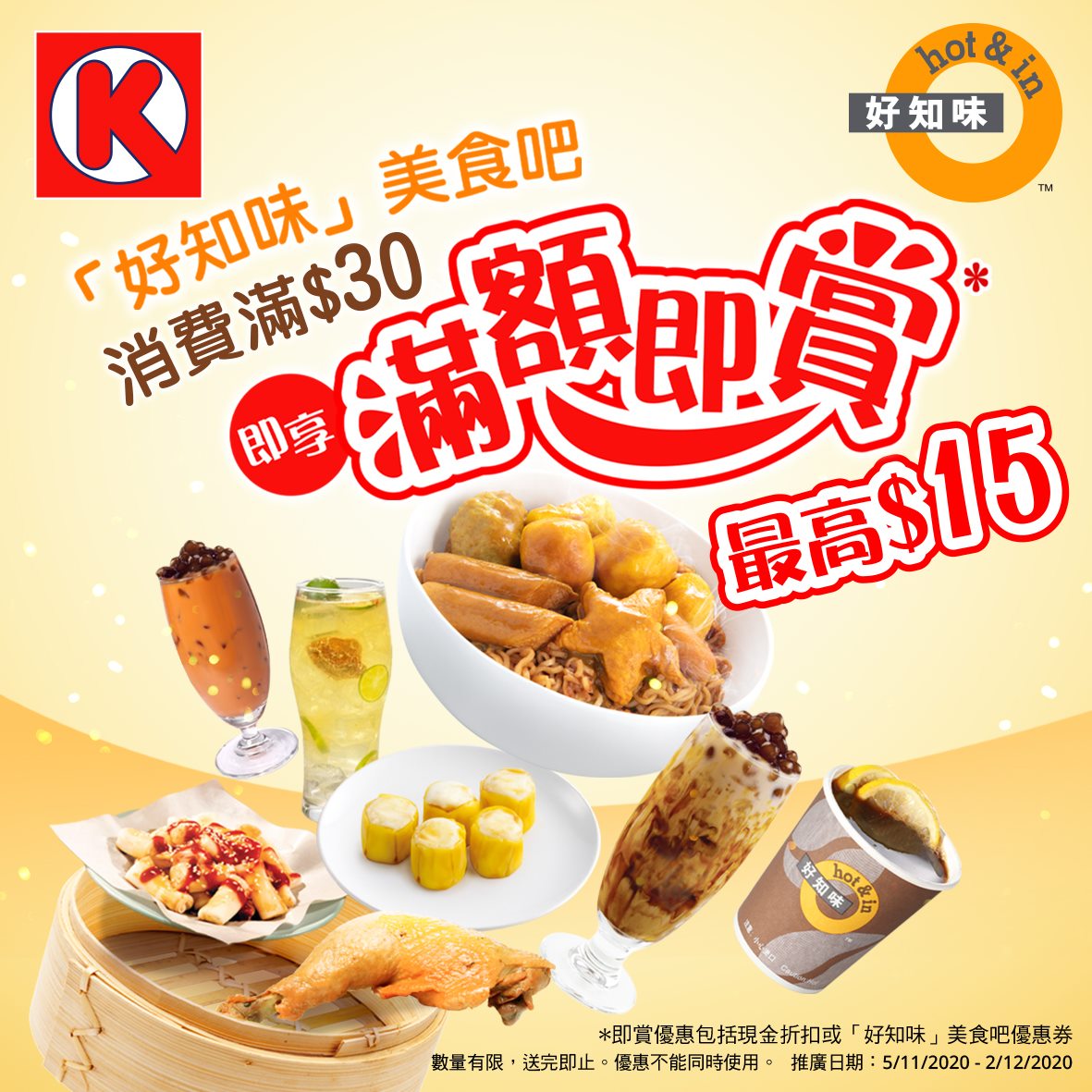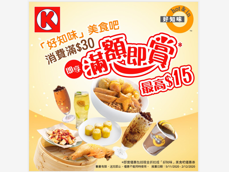 好知味美食吧消費滿$30即享滿額即賞,即賞優惠包括現金折扣或好知味美食吧優惠券! 最高即減$15