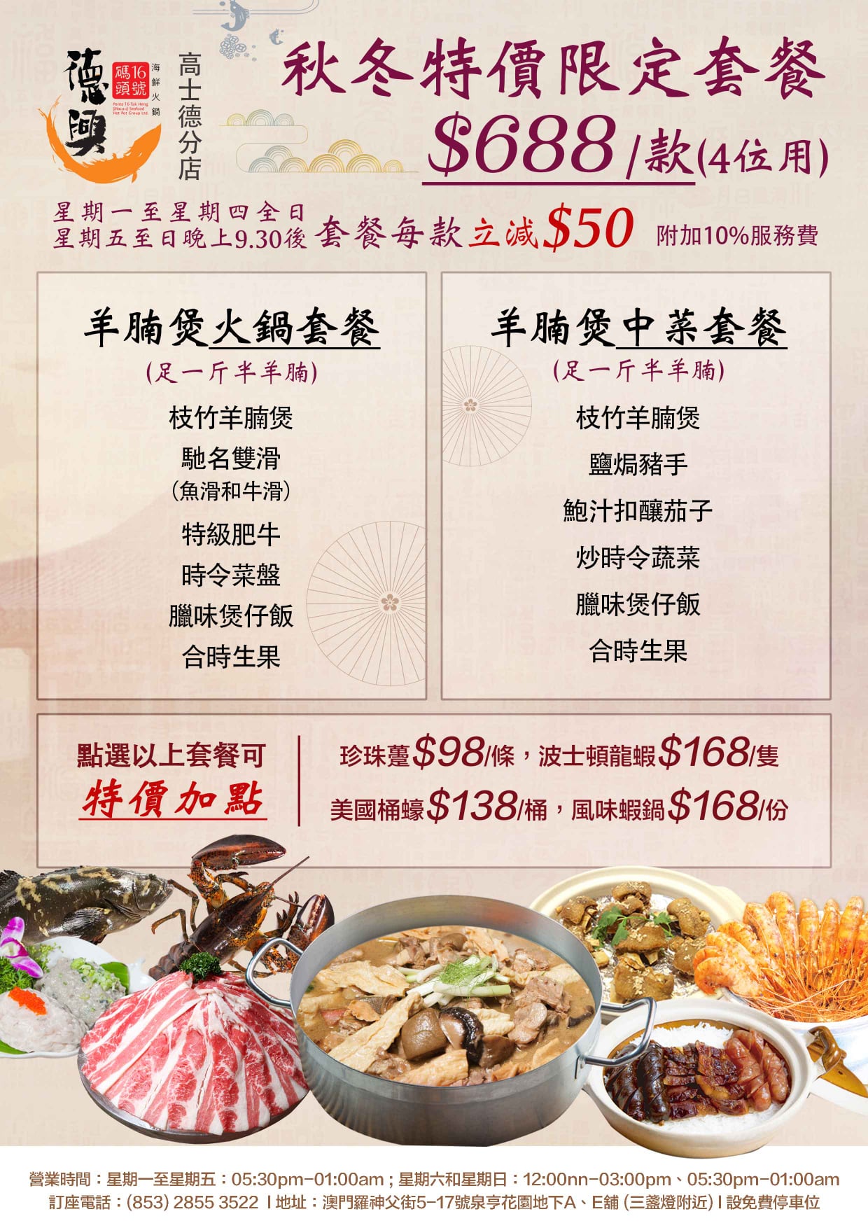 星期一至星期四全日、星期五至日晚上9.30後【秋冬限定羊腩煲套餐】立減$50!