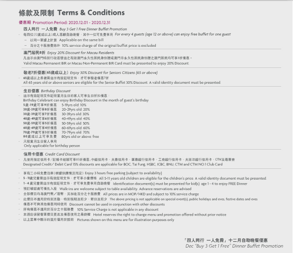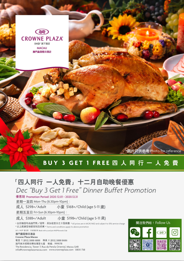 澳門皇冠假日酒店自助晚餐 12月1日起繼續【四人同行, 一人免費】自助餐平日每位只需 MOP298元。