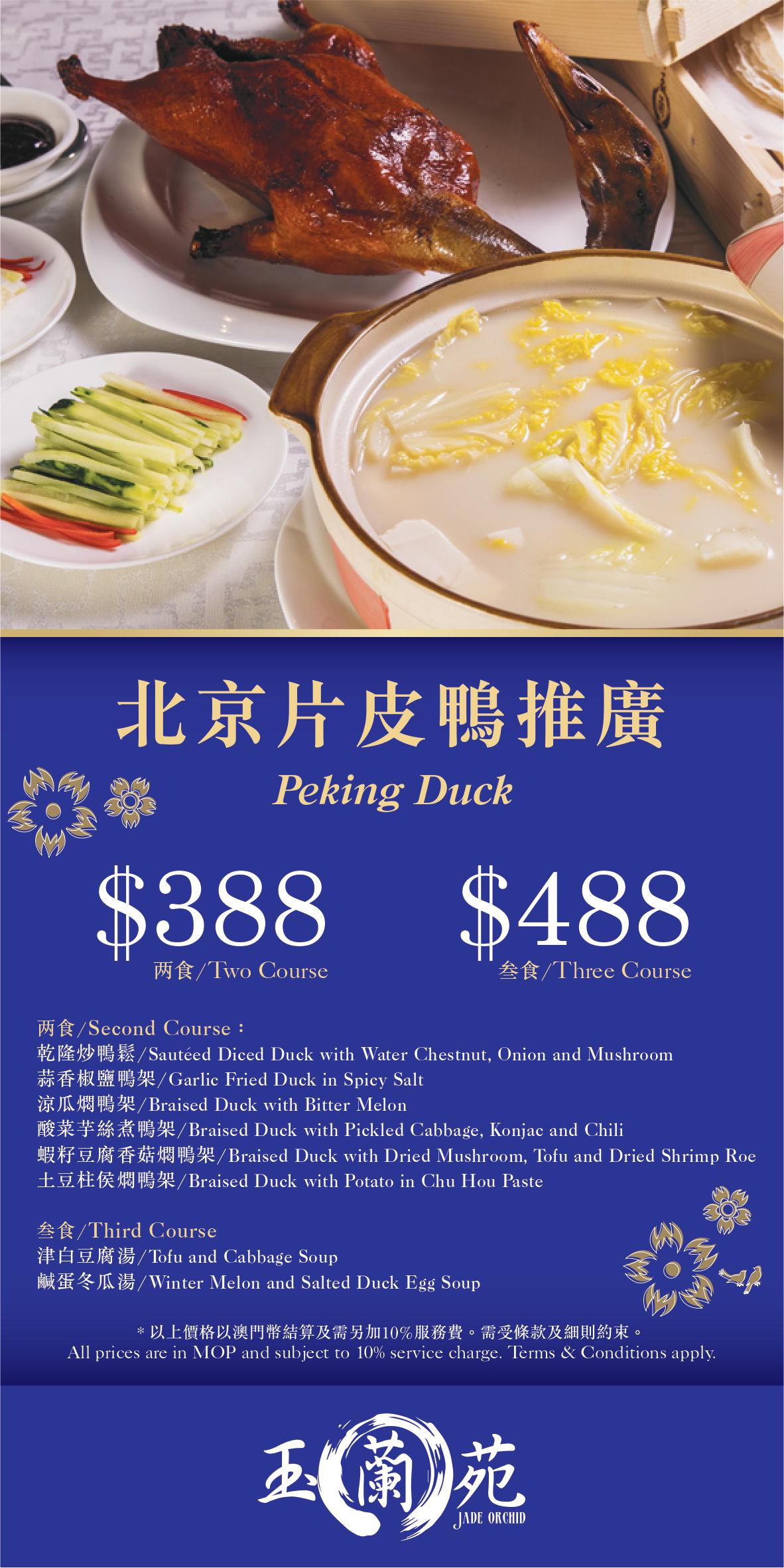 價錢:烤鴨二食 - 澳門幣388元起;烤鴨三食 - 澳門幣488元起
