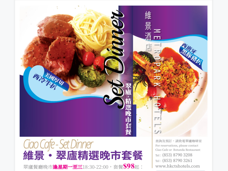 美國厚切西冷牛扒、西班牙黑豚豬扒、美式烤豬仔骨、扒法國春雞紅酒汁、香檳汁菠菜魚柳、忌廉芝士焗海鮮飯、肉醬焗意大利粉