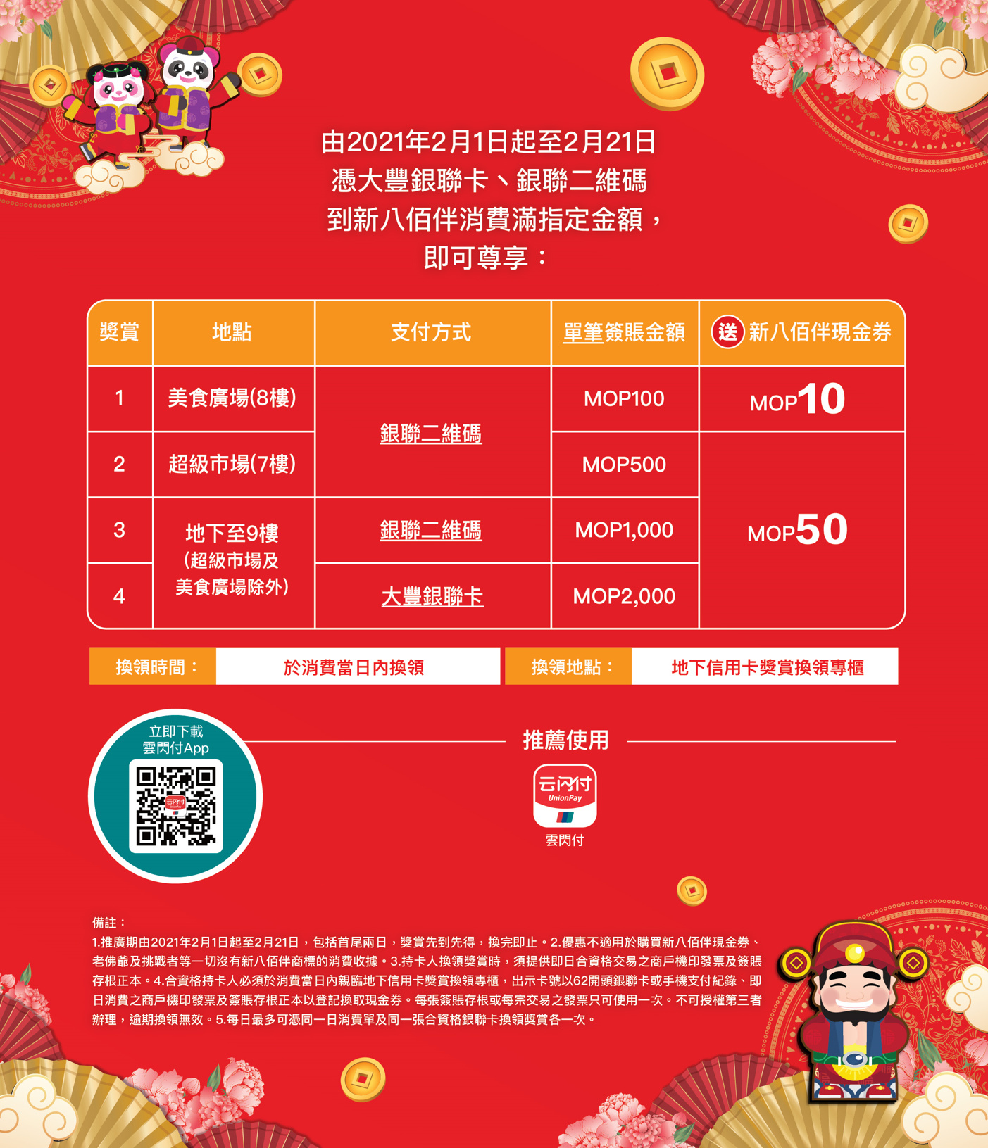 2021年2月1日起至2021年2月21日,憑大豐銀聯卡、銀聯二維碼到新八佰伴消費,單筆簽賬滿指定金額,即可換領高達MOP50現金券。