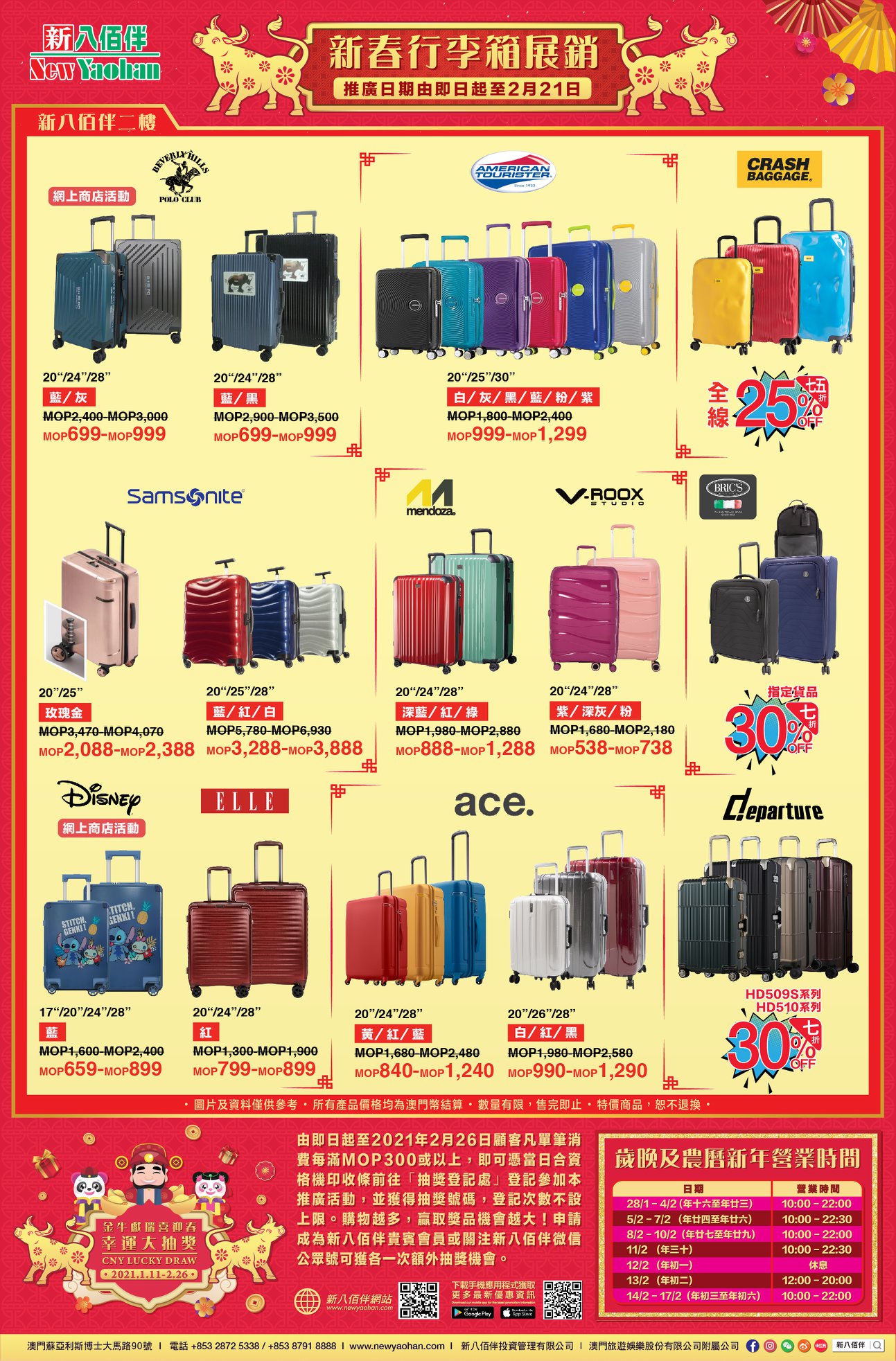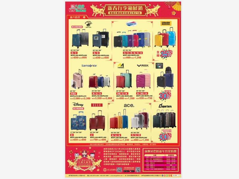 即日起至2月21日,新八佰伴2樓舉行新春行李箱展銷。場內有多款知名品牌嘅行李箱以震撼價出售,優惠低至24折起!款式多樣,性價比超高,記得買完落地下參加抽獎呀!