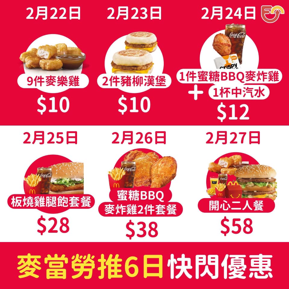 麥當勞又推快閃優惠啦!2月22日開始一連6日,日日新鮮。其中最受歡迎的10蚊9件麥樂雞將打頭陣。