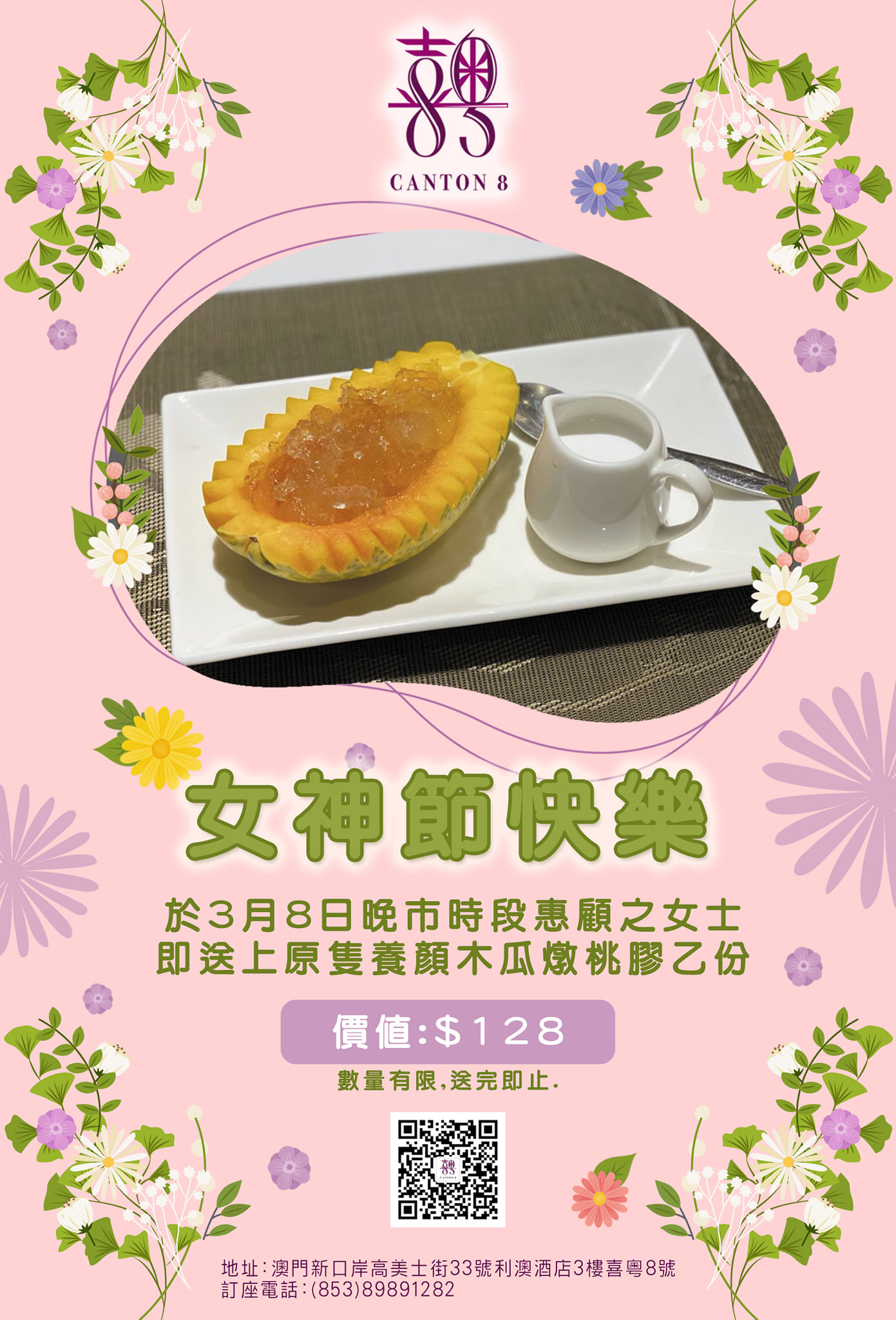 3月8日當日晚市時段,凡於喜粵8號用餐之女士, 均可免費享用養顏木瓜燉桃膠乙份 (價值$128),數量有限送完即止。