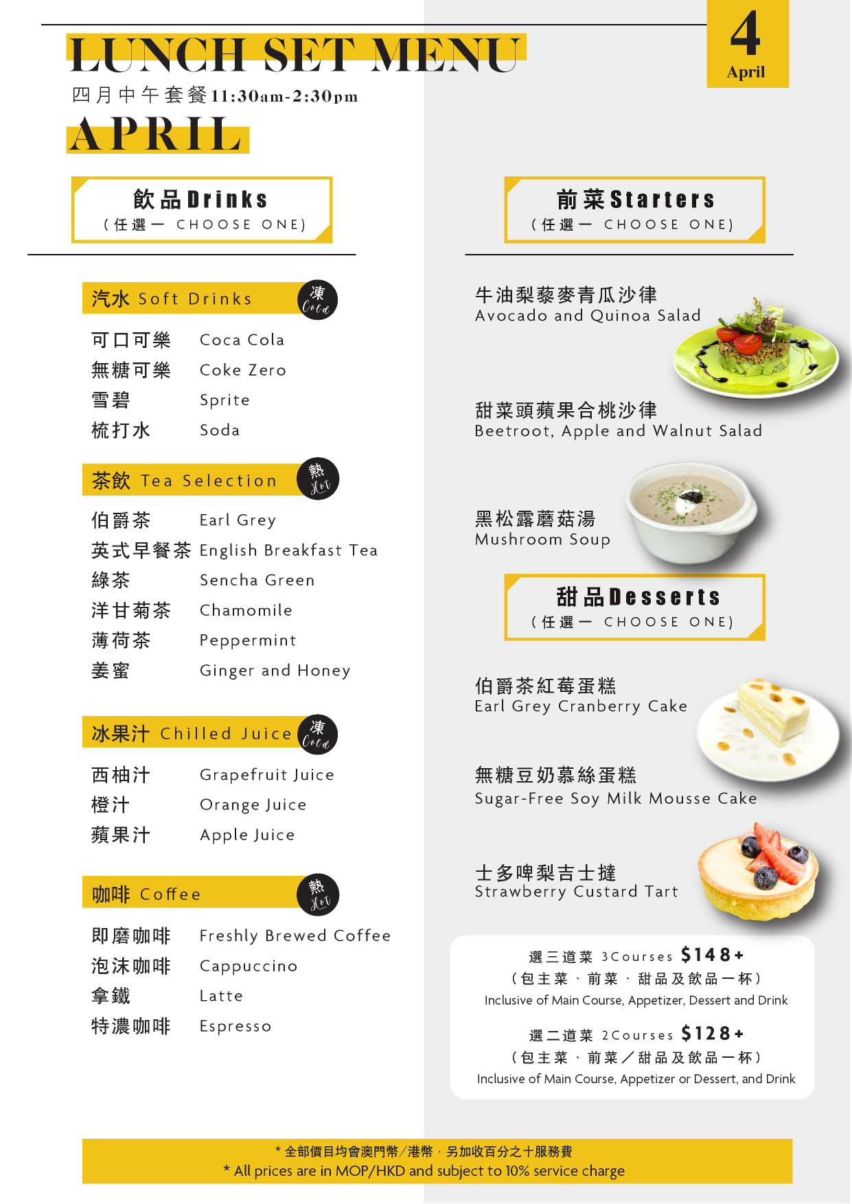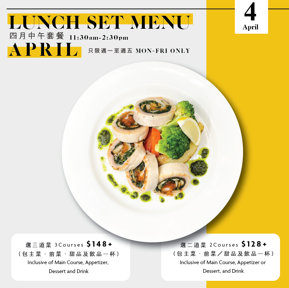 四月,藍灣餐廳繼續爲您提供美味及營養均衡的午市套餐。現在餐單更有素食提供,給您多樣的選擇,讓您輕鬆選擇適合自己的午餐。我們等待您的光臨!