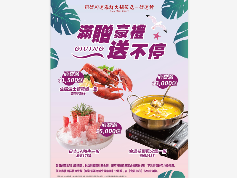 2021年5月1日起至5月31日期間,到店消費滿對應金額,即可獲贈相應菜式優惠券1張。