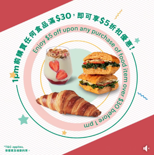 享受一頓美味的早餐亦可為身心注入滿滿的元氣!由即日起至7月13日,下午1時前親臨分店購買任何食品滿MOP30,即可享MOP5折扣優惠!(需出示「21天Live Well之旅」網頁內的電子優惠券)!