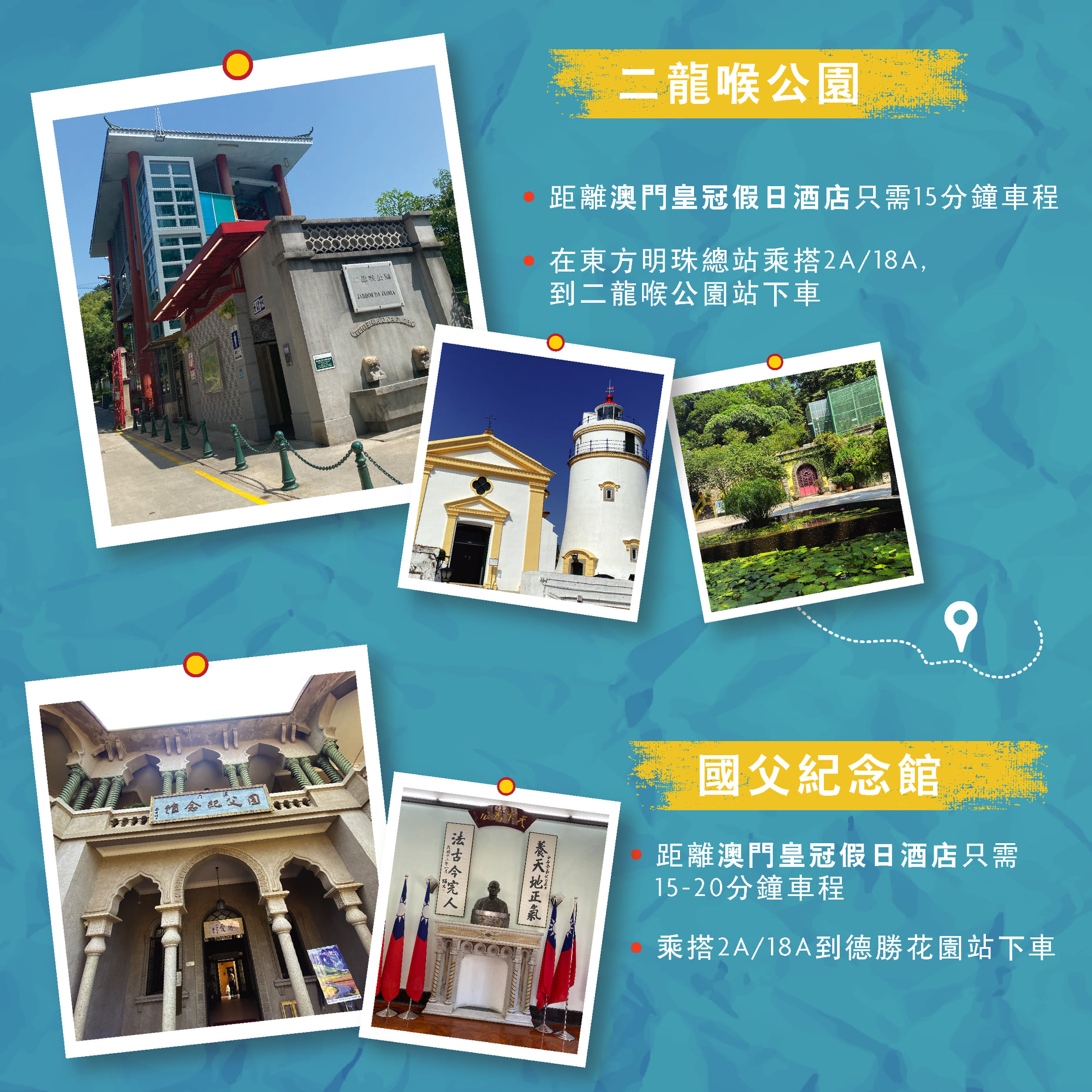 #澳門皇冠假日酒店 車程只需15分鐘, 在東方明珠總站乘搭2A, 18A 到二龍喉公園站下車就到。二龍喉公園擁有全世界最短纜車, 整段纜車車程大約只需要1分鐘。纜車直達松山市政公園-澳門市區內唯一動物園區的公園, 另外公園亦可登上東望洋燈塔及參觀松山軍用隧道。適合一家親子樂的好地方。