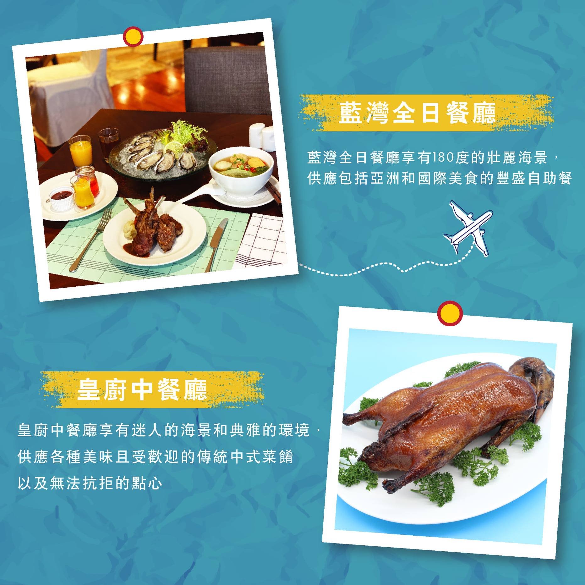 澳門皇冠假日酒店提供高雅的中餐廳和精美的全日餐廳等各種用餐選項。皇廚中餐廳享有迷人的海景和典雅的環境,供應各種美味且受歡迎的傳統中式菜餚以及無法抗拒的點心。藍灣全日餐廳享有180度的壯麗海景,供應包括亞洲和國際美食的豐盛自助餐。