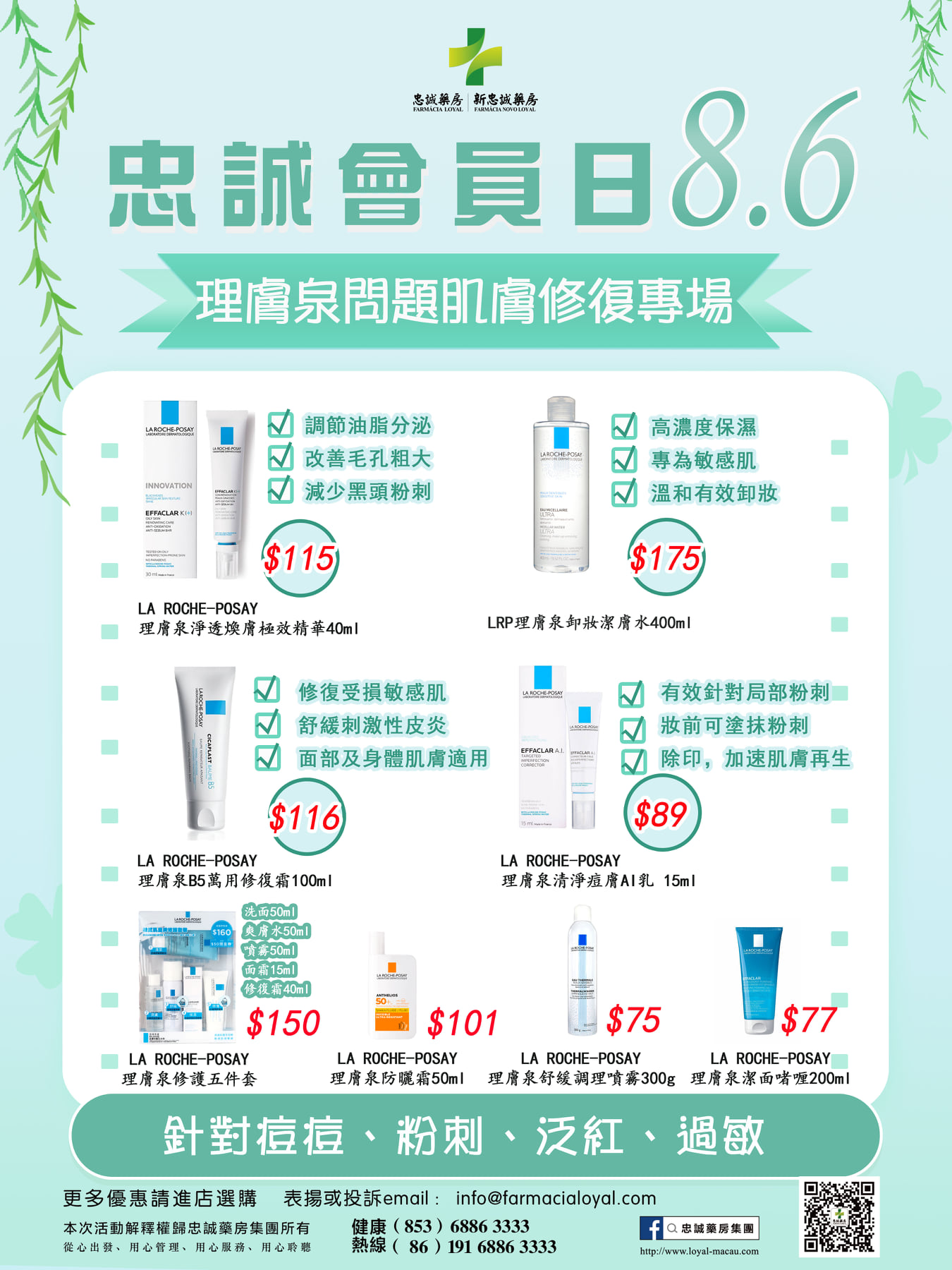 忠誠會員日(8月6日):理膚泉問題肌膚修復專場低至$75!