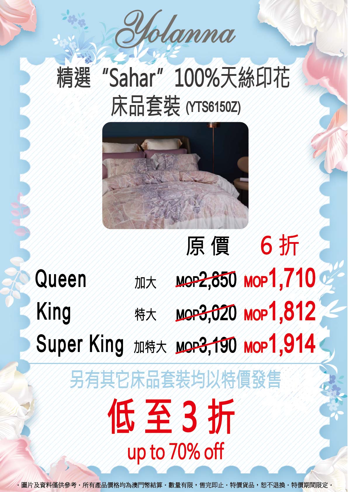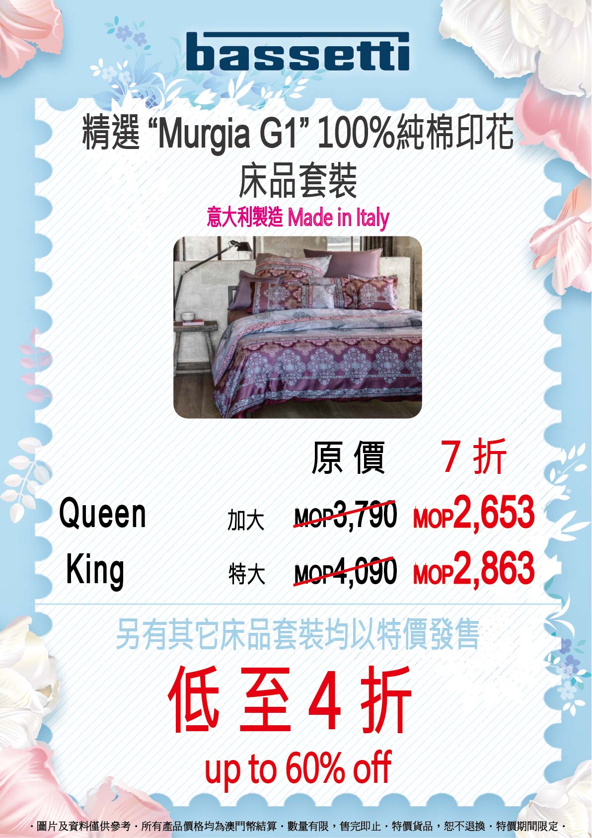 即日起至9月26日,意大利百年品牌bassetti同埋高端品牌yolanna限時優惠低至3折起!bassetti以獨特嘅印花以及圖騰帶俾您唔同嘅異域風情,100%精梳棉系列四件套加大至特大,特價只需MOP2,863起;yolanna堅持傳統工藝,採用品質純天然原料,100%天絲印花系列四件套加大至超特大特價只需MOP1,710起!