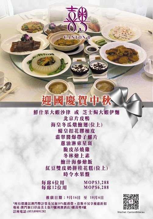 澳門喜粵8號於這個節日呈獻精選佳節套餐,讓您與摯愛親朋相聚慶祝。