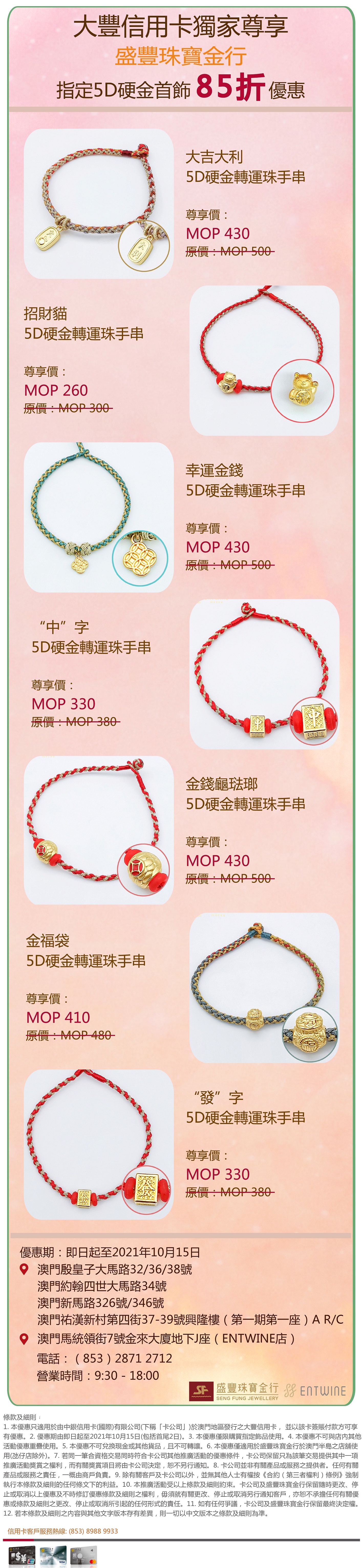 推廣內容:憑大豐信用卡於盛豐珠寶金行全線店舖(氹仔店除外)購買指定5D硬金首飾,即享獨家85折優惠。