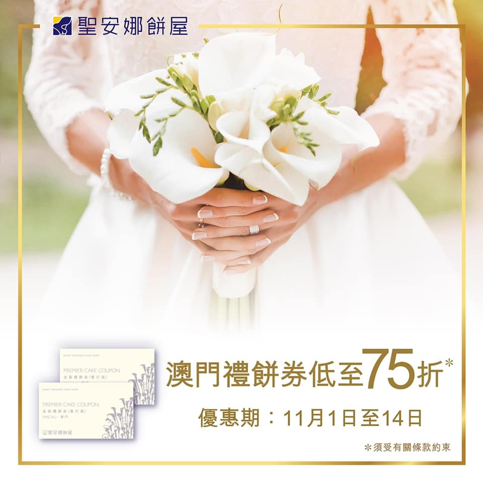 由即日起至11月14日,於澳門聖安娜購買禮餅券即享低至75折。