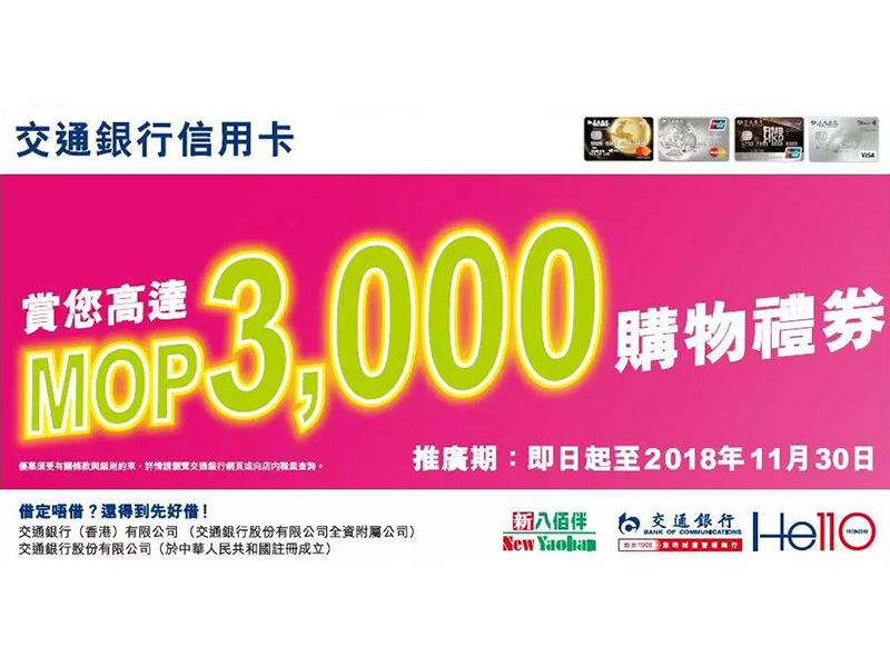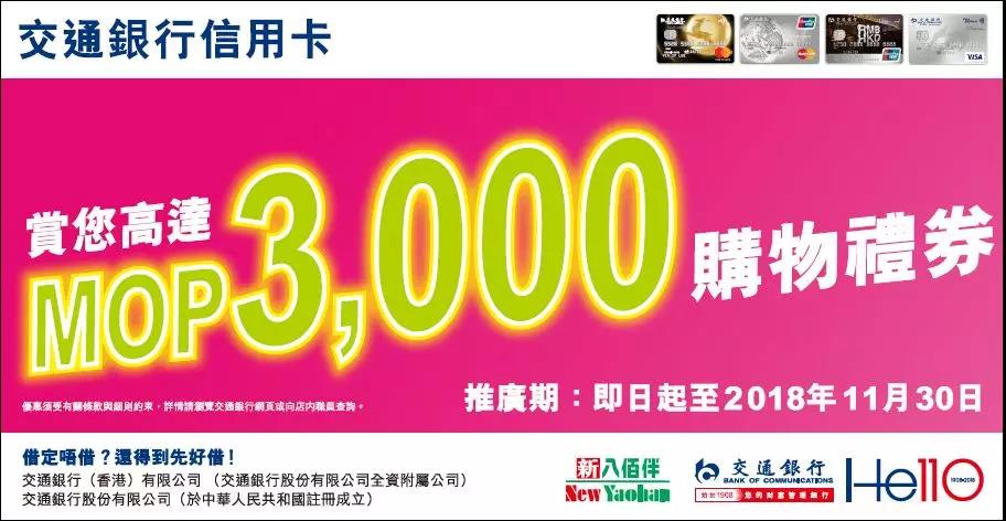 (獎賞1)憑交通銀行信用卡於新八佰伴單日累積簽賬金額滿澳門幣2,000元或以上,可獲贈新八佰伴現金券100元;