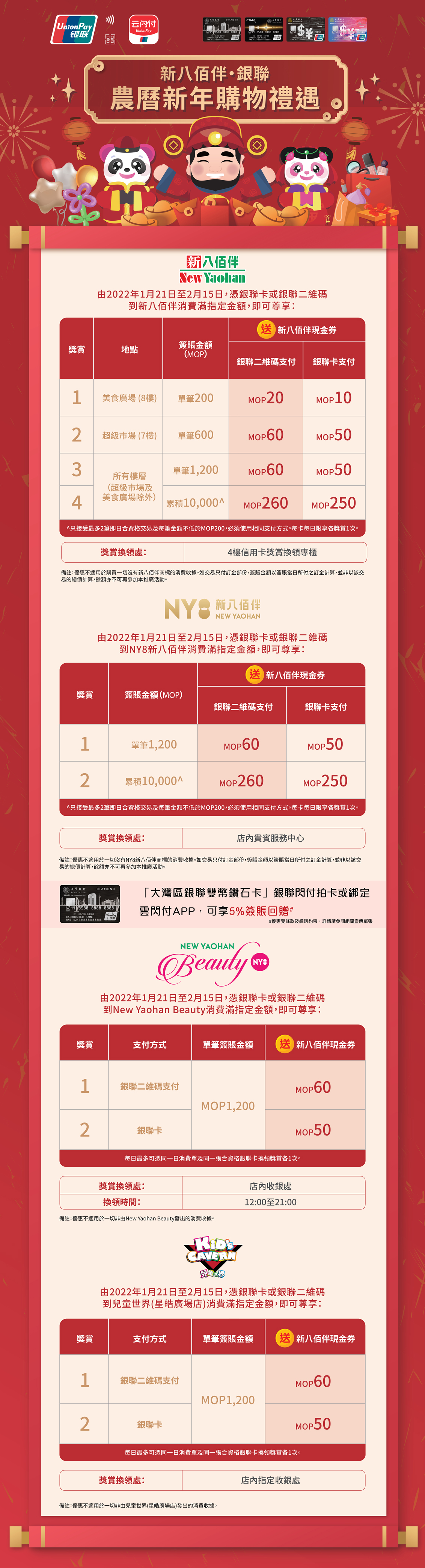 推廣內容:憑銀聯卡或銀聯二維碼到新八佰伴 / NY8新八佰伴 / New Yaohan Beauty / 兒童世界(星皓廣場店)消費滿指定金額,即可換領新八佰伴現金劵,價值高達MOP510。