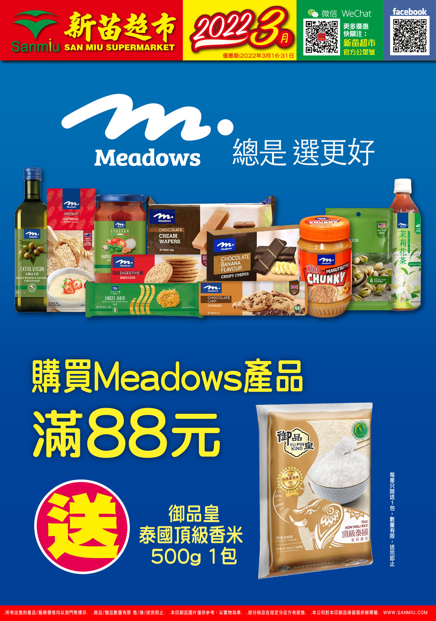 依家買任何Meadows產品滿$88,即送御品皇泰國香米500g1包!!快啲嚟新苗選購,享受Meadows帶嚟嘅優質滋味