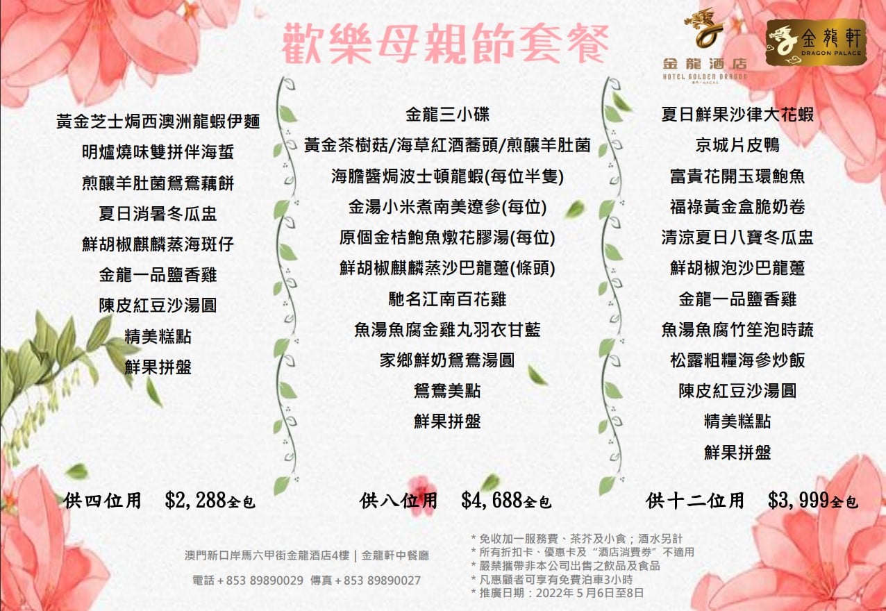 特別設計「歡樂母親節套餐」只需MOP$2288起 ,奉送鮮果拼盤和甜品。