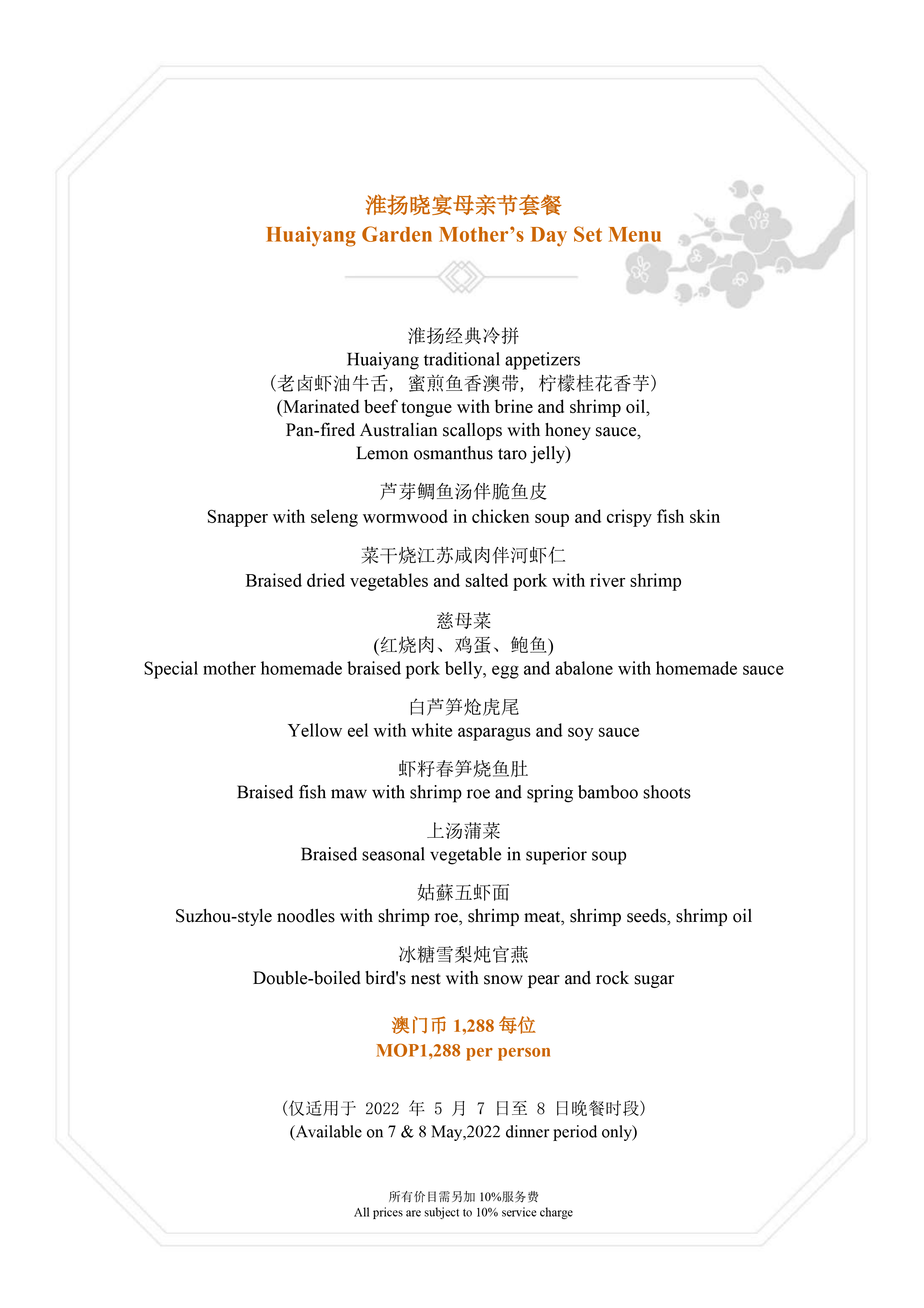 為歡慶一年一度的母親節,淮揚曉宴將於今個母親節推出一系列深情厚意的美饌,網羅各地風情美食,讓賓客表達對母親真摯的愛,與全家人共享天倫。