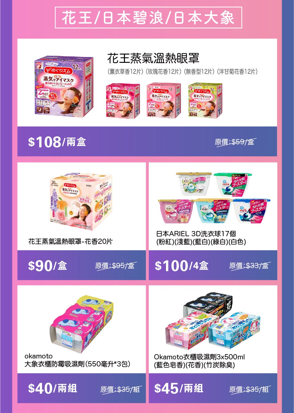 購買精選洗護即送禮品、日本花王眼罩$108/兩盒、洗衣球$100/四盒、大象稀釋劑$40/兩盒
