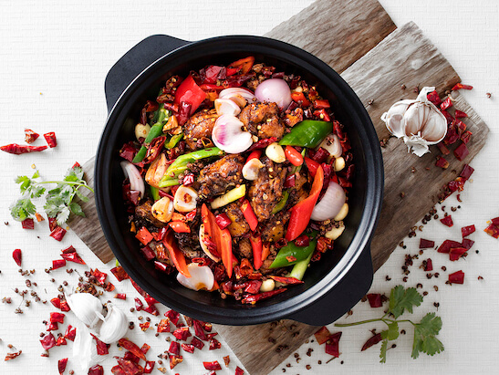 麻辣雞煲是四川、重慶地區的傳統菜餚,以香辣為特色,吃完雞肉後還可加湯涮菜繼續吃。隨著川蜀餐飲的興盛,在許多外省的餐廳都可以品嚐到這道菜,尤其是於中國北方地區,深受老百姓喜愛。