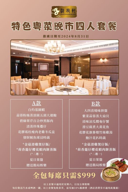 駿龍軒加推特色「粵菜晚市四人套餐」,除了贈送鵲局娛樂外,套餐包含多款時令海鮮、小炒及主菜,兩款套餐任由選擇,每席都只需MOP999+10%!座位需提前預訂!