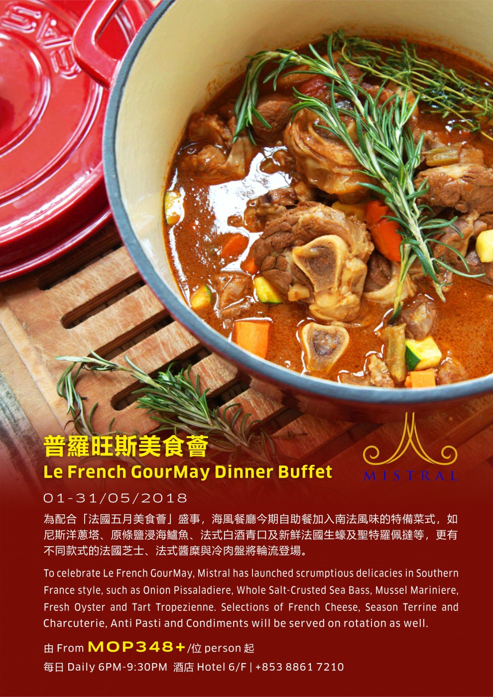 為配合「法國五月美食薈」盛事,海風餐廳今期自助餐加入南法風味的特備菜式,如尼斯洋蔥塔、原條鹽浸海鱸魚、法式白酒青口、新鮮法國生蠔及聖特羅佩撻等,更有不同款式的法國芝士、法式醬糜與冷肉盤將輪流登場。