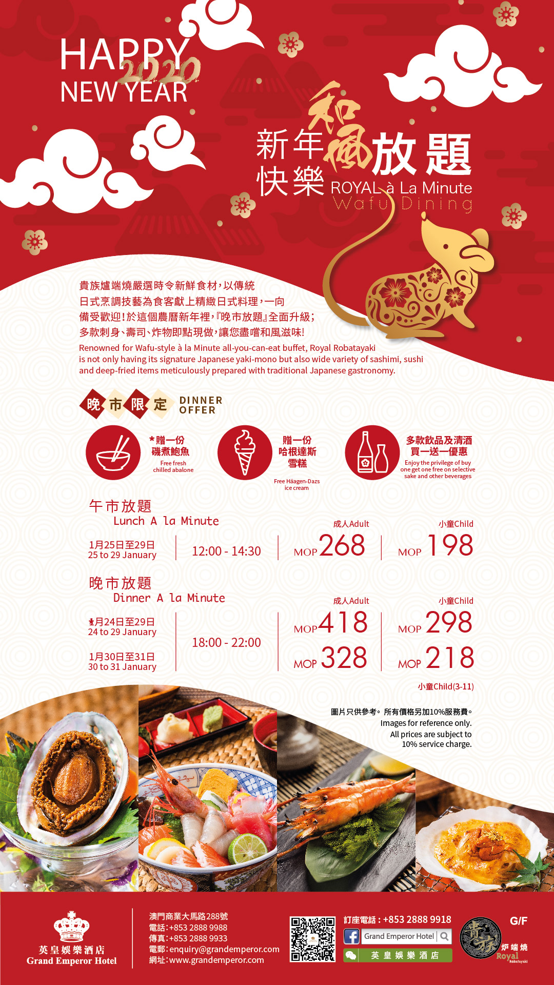 貴族炉端燒嚴選時令新鮮食材,以傳統日式烹調技藝為食客獻上精緻日式料理,一向備受歡迎!於這個農曆新年裡,「晚市放題」全面升級;多款刺身、壽司、炸物即點現做,讓您盡嚐和風滋味!
