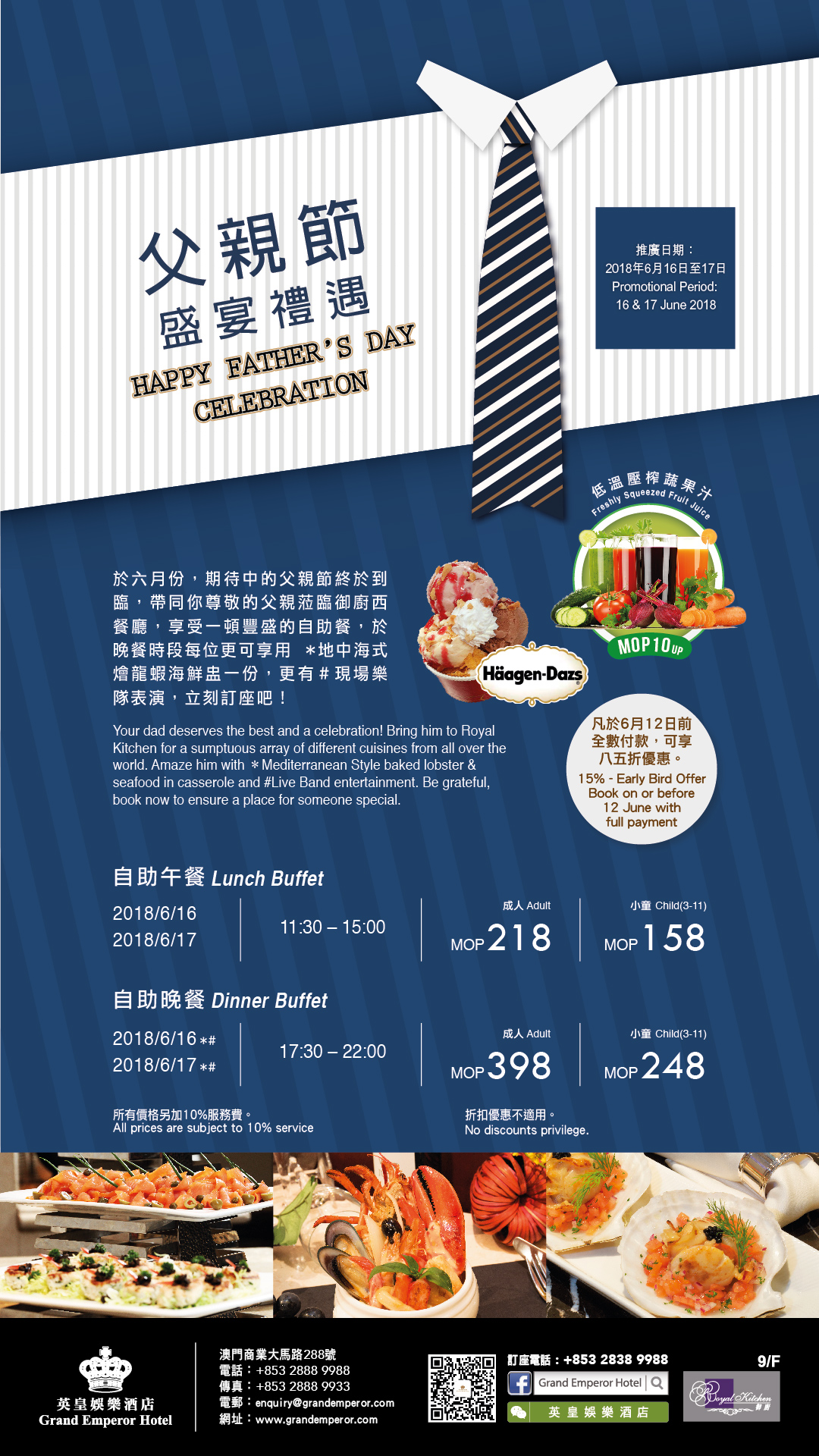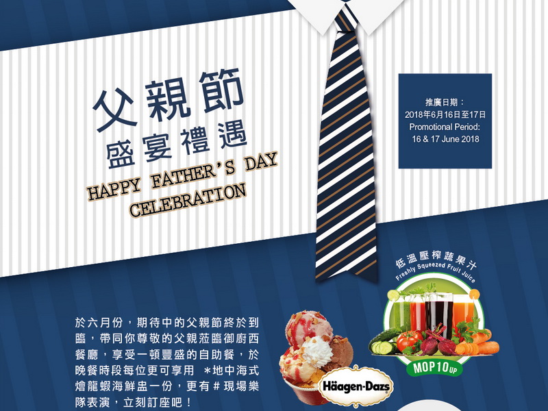 於六月份,期待中的父親節終於到臨,带同你尊敬的父親蒞臨御廚西餐廳,享受一頓豐盛的自助餐,於晚餐時間每位更可享用地中海式繪龍蝦海鮮盅一份,更有現場樂隊表演,立刻訂座吧!