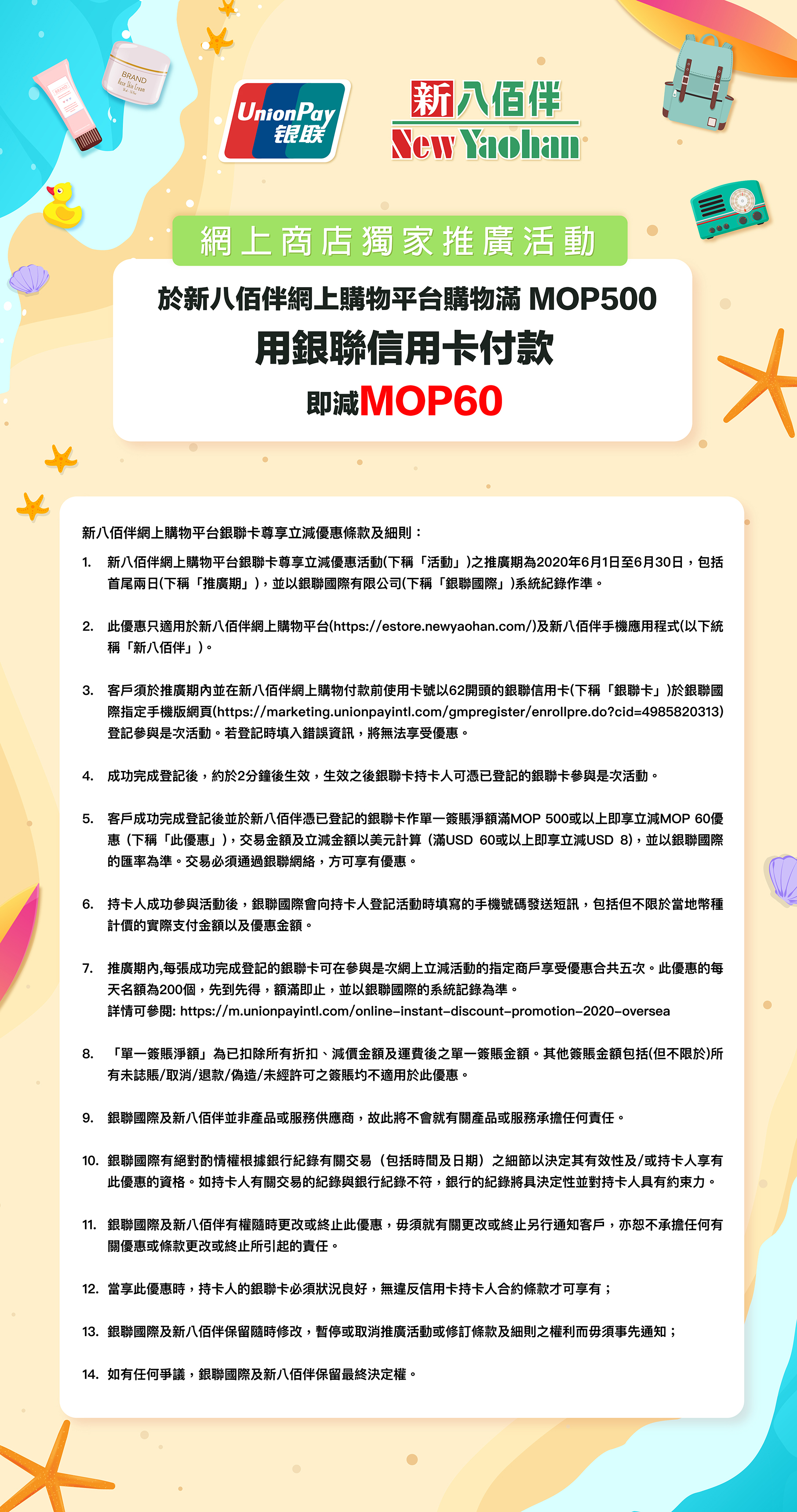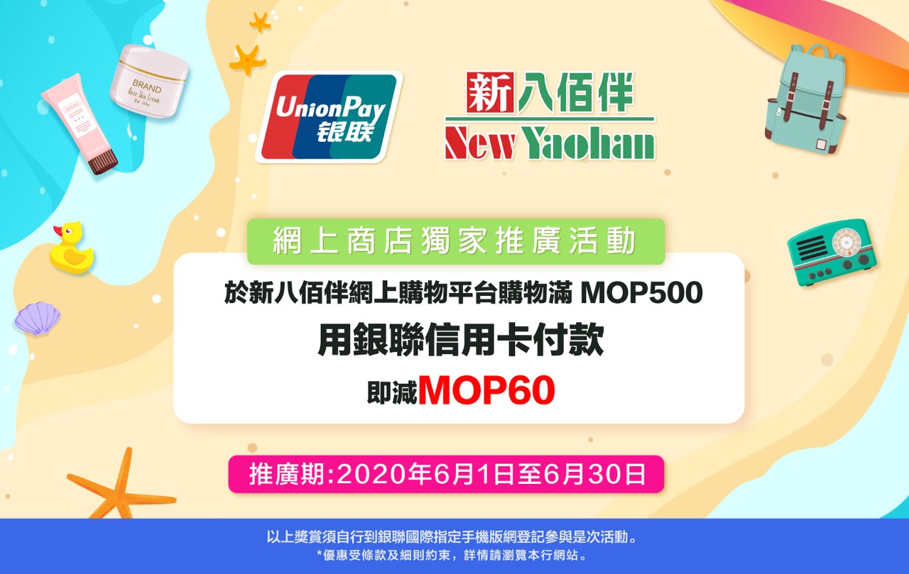即日起至6月30日,憑卡號以62開頭銀聯信用卡於銀聯國際手機版網頁先登記,並於新八佰伴網上購物平台單一簽賬消費淨額滿MOP500或以上,即可享減MOP60優惠,每張成功登記銀聯信用卡活動期內最多可享以上優惠5次。