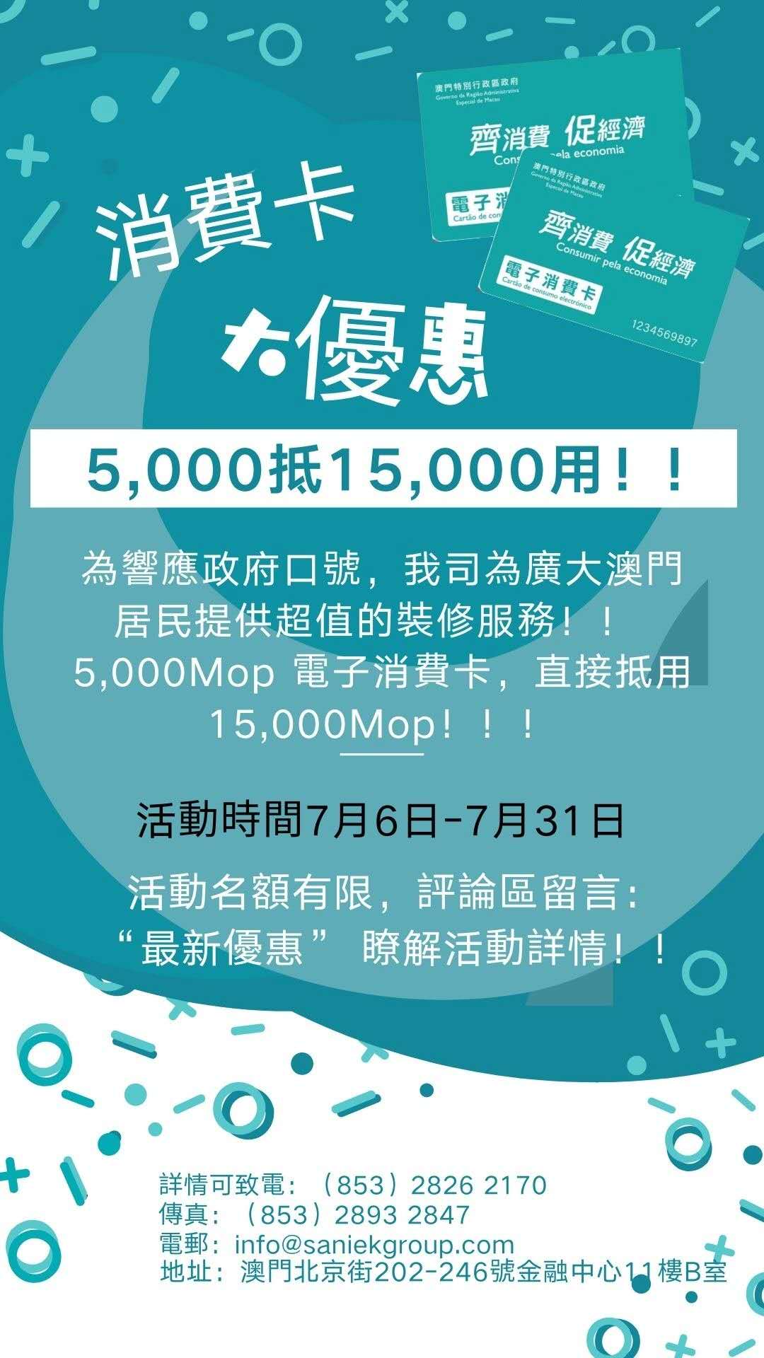 據悉8月份將有新的一輪援救措施,每位澳門居民發放澳門幣$5000電子消費金,爲此我司也積極響應政府號召,即日起至2020年7月31日我司爲廣大的澳門居民提供超值的裝修服務。