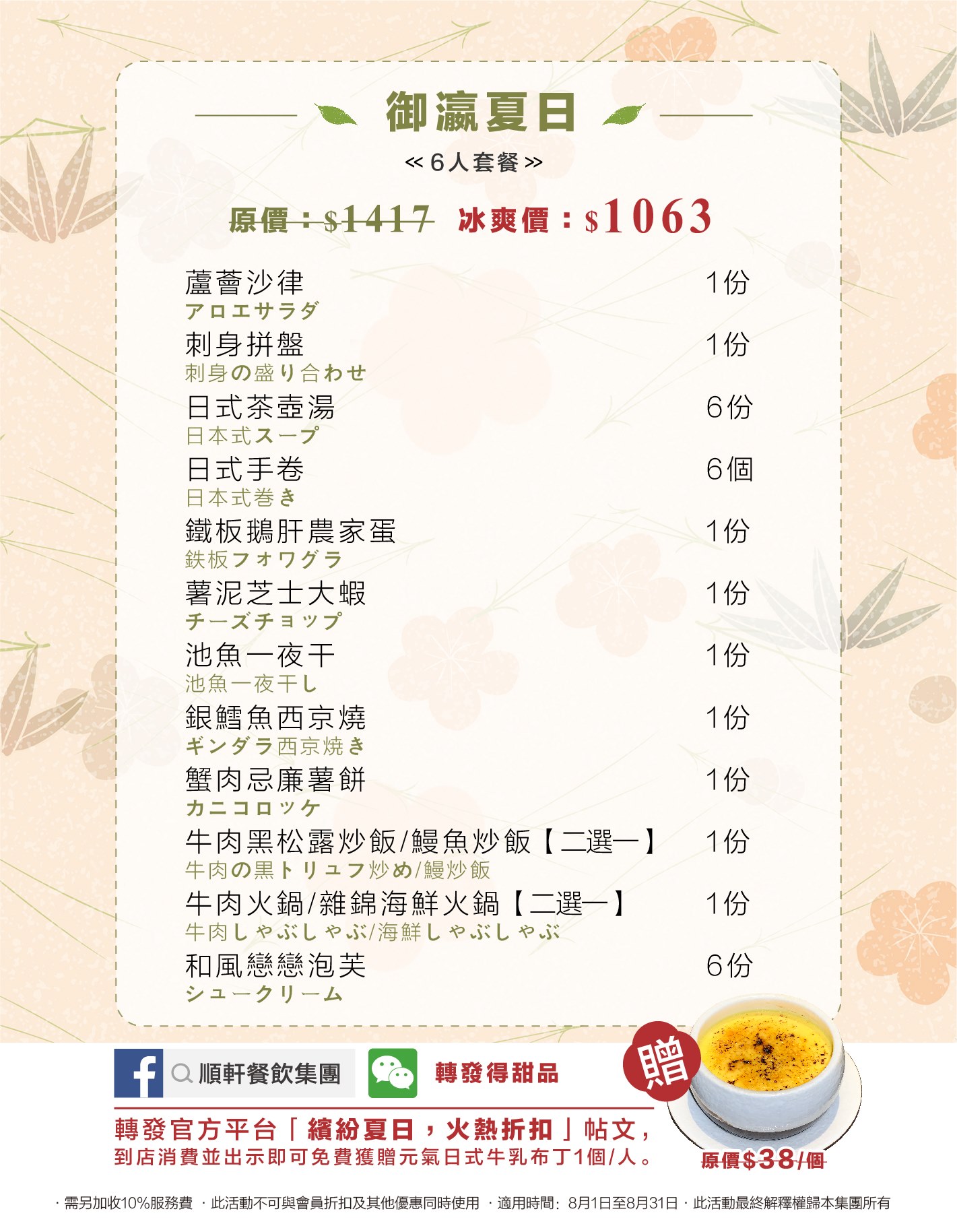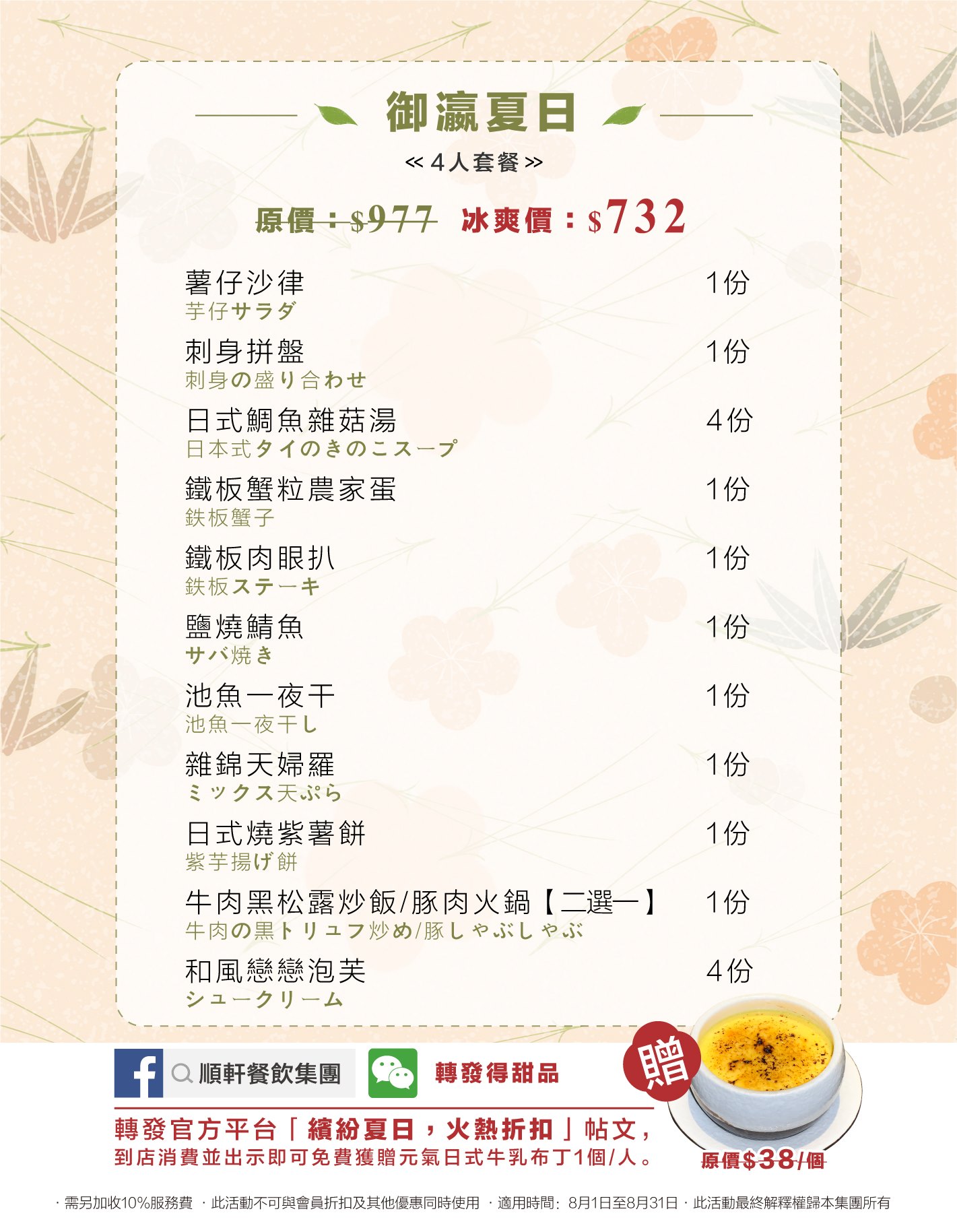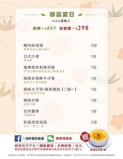 登錄Facebook順軒餐飲官方平臺,轉發御瀛繽紛夏日,火熱折扣帖文,並向門店工作人員出示,立得日式焦糖牛乳布丁1杯!