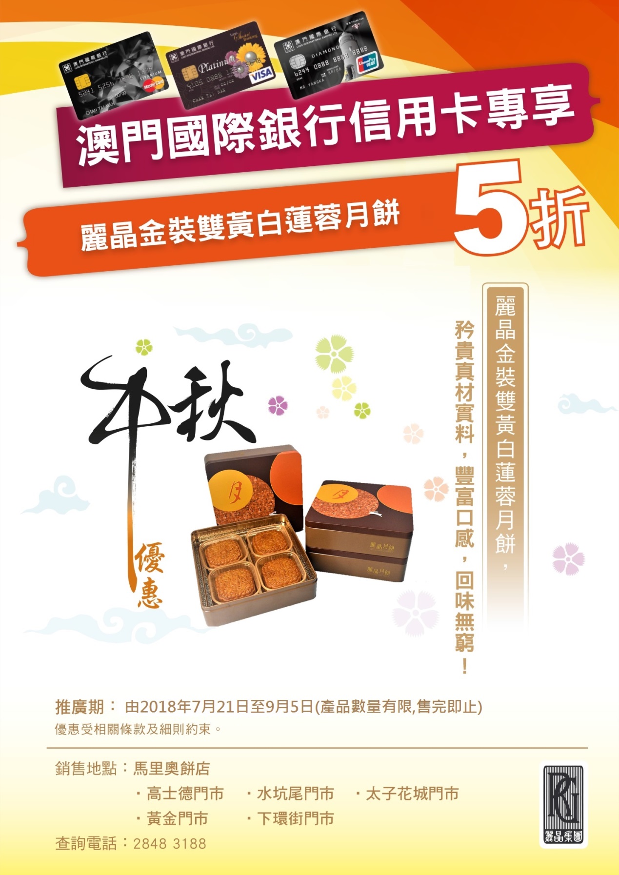 澳門國際銀行信用卡專享 - 麗晶金装雙黃白蓮蓉月餅5折