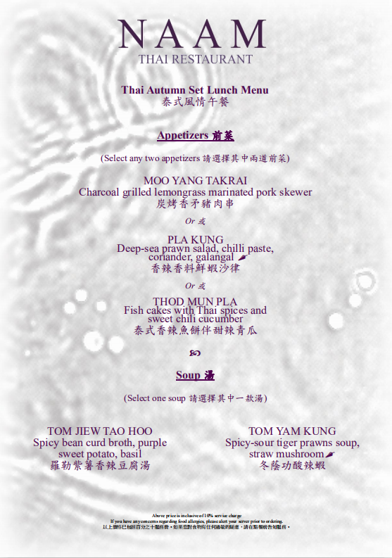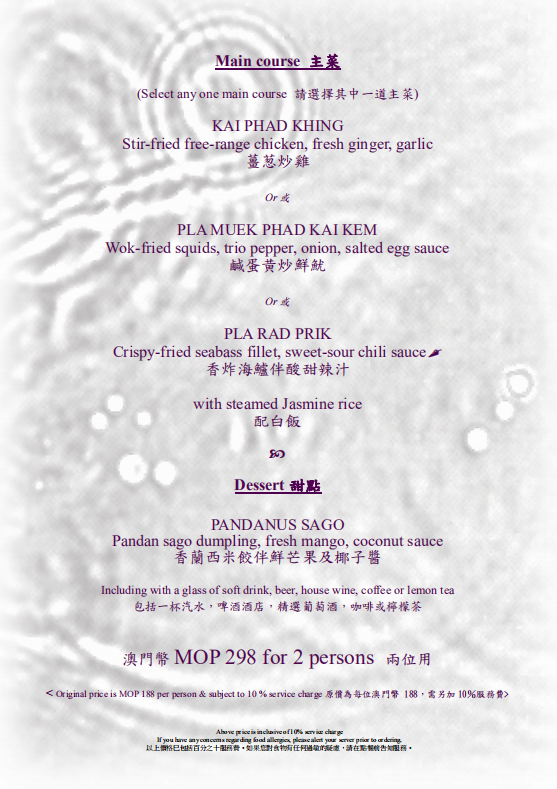全新泰式午市套餐,優惠價澳門幣298元/兩位,包括開胃拼盤,湯,主菜和甜品。