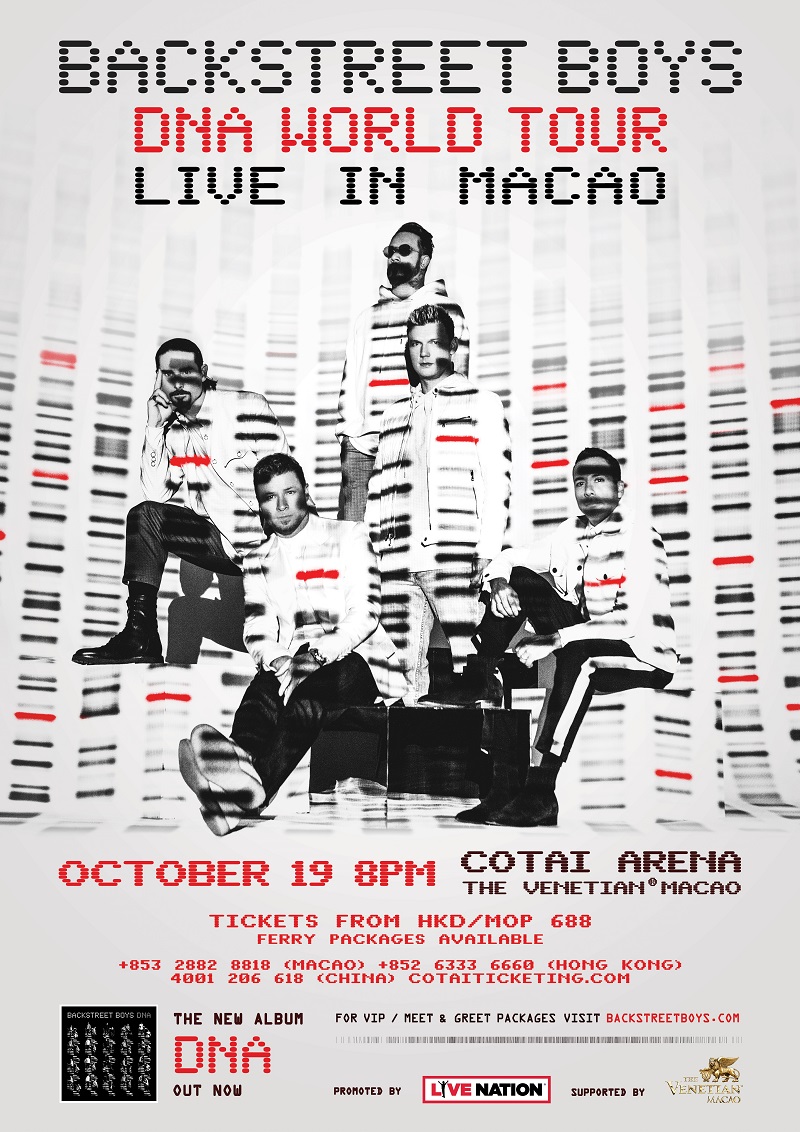 希望再次欣賞Backstreet Boys現場演繹20年來多首膾炙人口的經典名曲如「Quit Playing Games With My Heart」、「I Want It That Way」、「Everybody (Backstreet’s Back)」、「Incomplete」、「Shape Of My Heart」、「Show Me The Meaning Of Being Lonely」、「Don’t Go Breaking My Heart」等,萬勿錯過2019年的DNA世界巡迴演唱會澳門站。