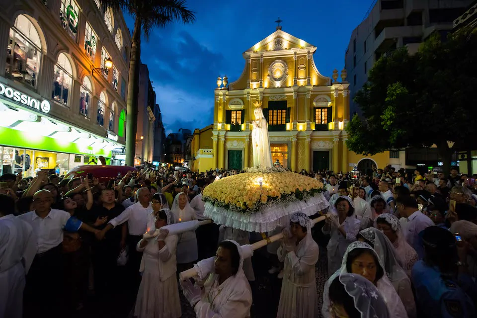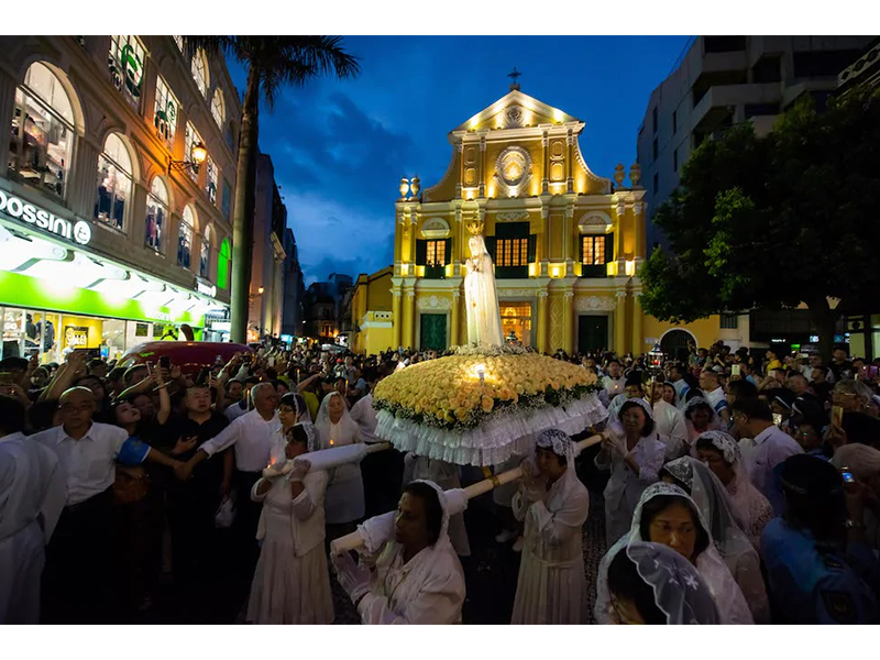 「花地瑪聖像巡遊」是紀念1917年,聖母在葡萄牙小鎮花地瑪內,多次在三位小牧童前顯現的事蹟。澳門的天主教徒為紀念這事蹟,每年均舉行特別彌撒及於彌撒後舉行聖像巡遊活動。花地瑪聖母聖像由身穿白衣、頭戴白紗的女士抬著,以玫瑰聖母堂為起點,經南灣及西灣往西望洋山西望洋聖堂前地,並舉行儀式。