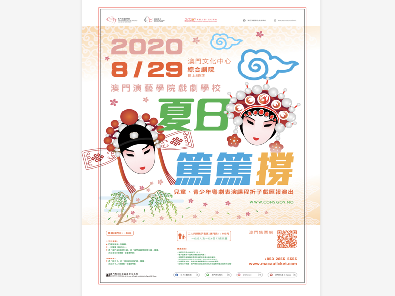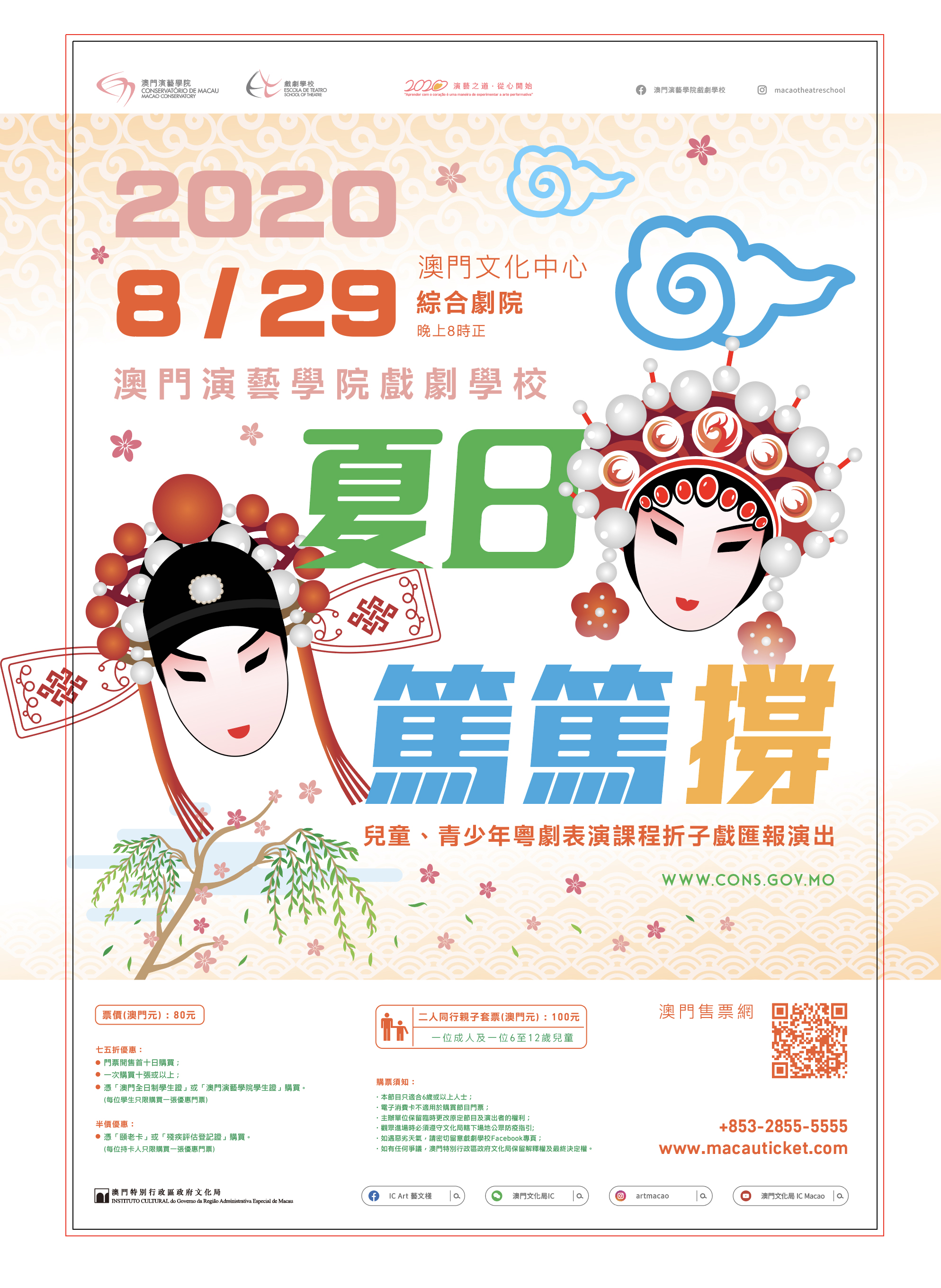 澳門演藝學院戲劇學校於2019年9月開展兒童、青少年粵劇表演課程,六十多名學員經過六個多月的基礎培訓,在導師們的悉心指導下,透過基毯課、身段課、把子課及唱腔課的訓練,循序漸進地認識粵劇的唱、做、唸、打四功表演程式和手、眼、身、法、步五法的演出基本功。今個夏日,導師因應學生的學習水平而排練了十四齣折子戲,包括了《帝女花》、《十八相送》、《春草闖堂之上路》及《羅通掃北選段》、《梁紅玉之擊鼓》、《蘆花蕩》等文場及武場戲兼備的膾炙人口劇目,及一項身段基功的展示,以饗觀眾及作為學員的年度匯報演出。