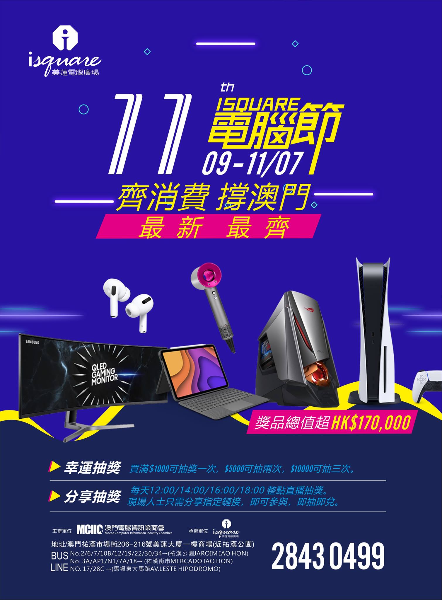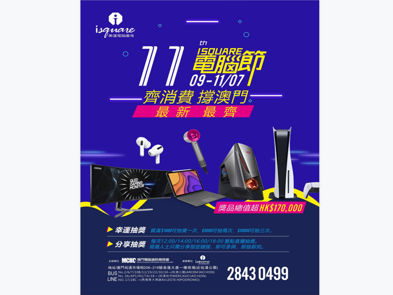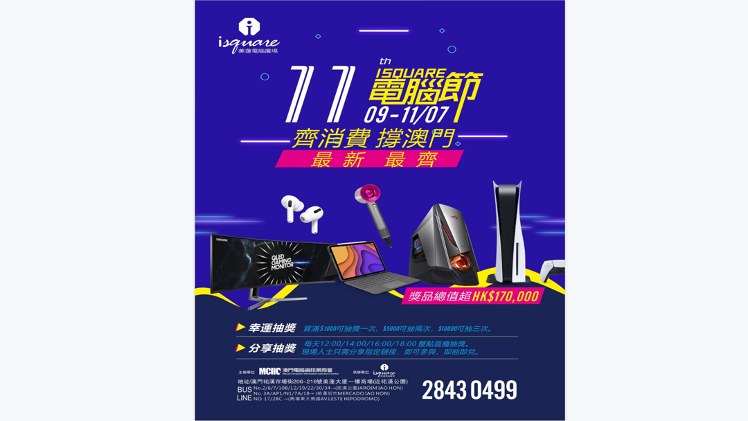 iSQUARE電腦廣場正式踏入第十一個年度,為回饋更多消費客戶,我哋再一次刷新抽獎獎品總值記錄"高達HKD170,000元"仲要喺100%中獎!現場仲設有免費整點抽獎活動,豐富獎品即抽即攞!