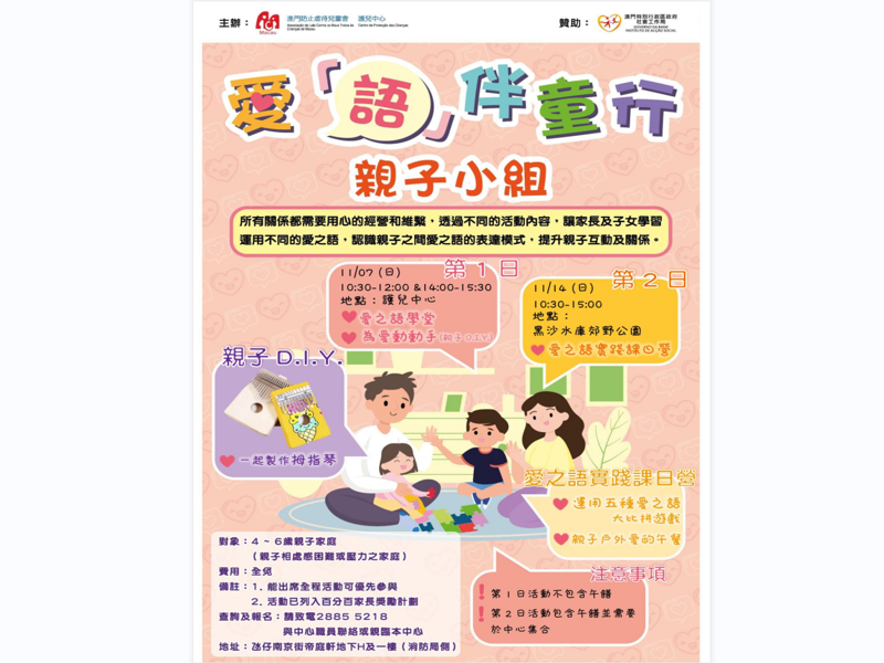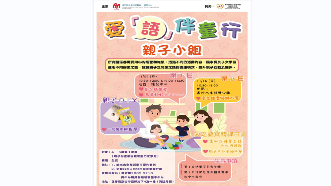 所有關係都需要用心的經營和維繫,透過不同的活動內容,讓家長及子女學習運用不同的愛之語,認識親子之間愛之語的表達模式,提升親子互動及關係。