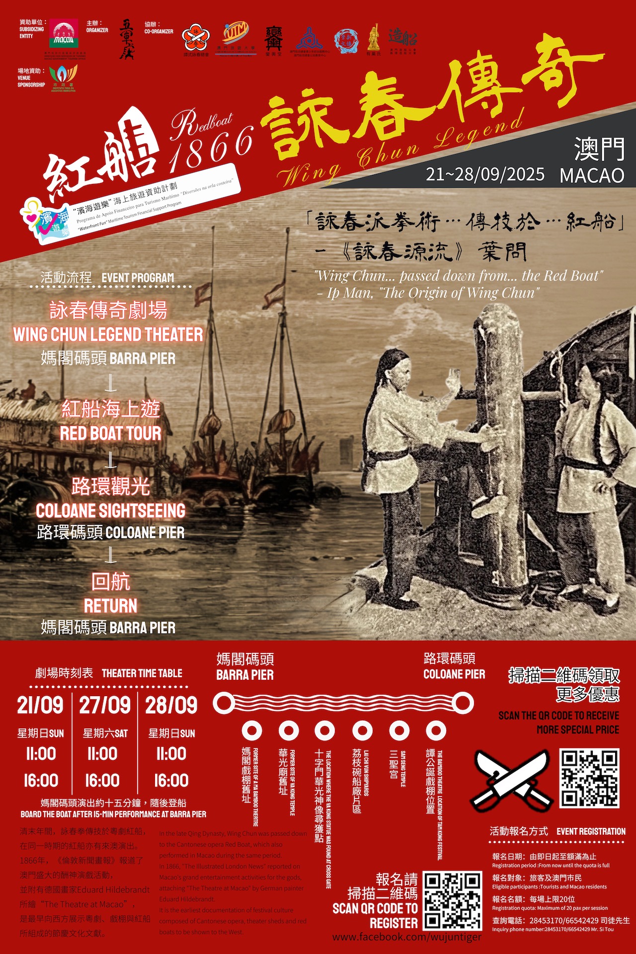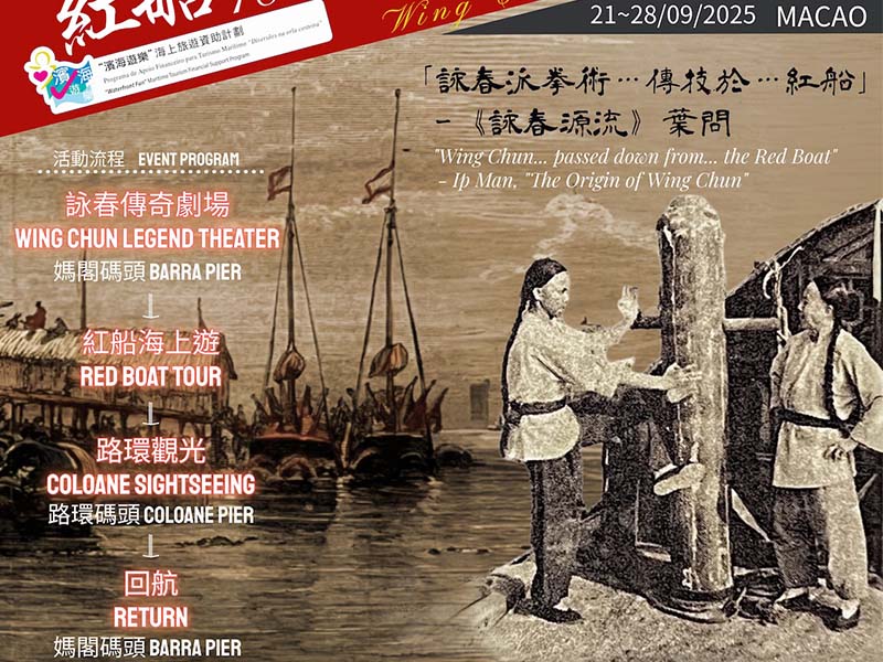 旅澳德國畫家Eduard Hildebrandt創作的版畫《The Theatre at Macao》於1866年登上了《倫敦新聞畫報》,畫作中的媽閣戲棚和紅船自此成為澳門向西方展示粵劇的重要場景,加深了當時外國人對中華文化的了解。是次活動始於該畫作,以19世紀至20世紀初期間粵劇戲班往來的交通工具「紅船」為主軸,在媽閣碼頭觀賞「詠春傳奇劇場」,隨後登船開展「紅船海上遊」,到達路環碼頭後於路環市區觀光,最後回航至媽閣碼頭解散。